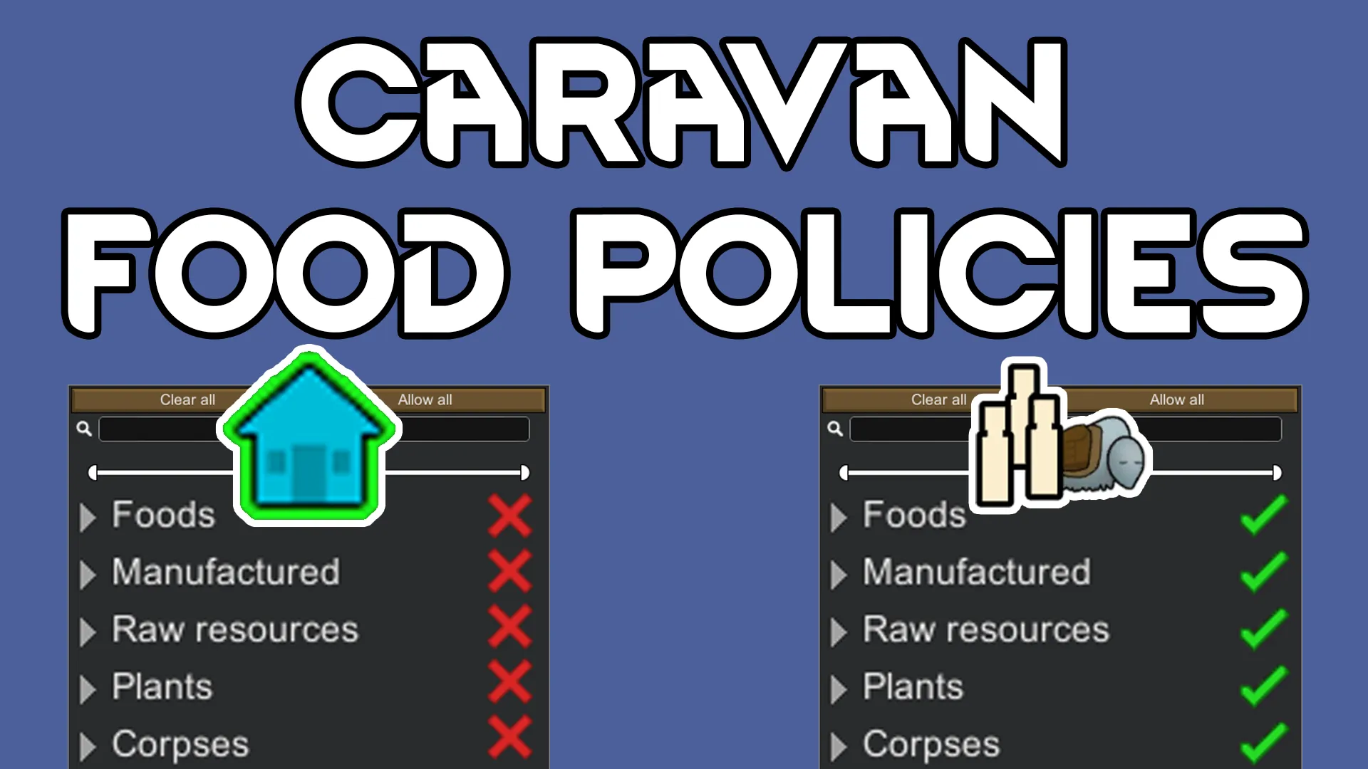 Adds the ability to a pawns current food policy, home food policy, and caravan food policy. Pawns will automatically switch to their caravan food policy when leaving on a caravan and switch to their home food policy when returning. Food policies can be easily managed in the <i>Assign</i> menu.