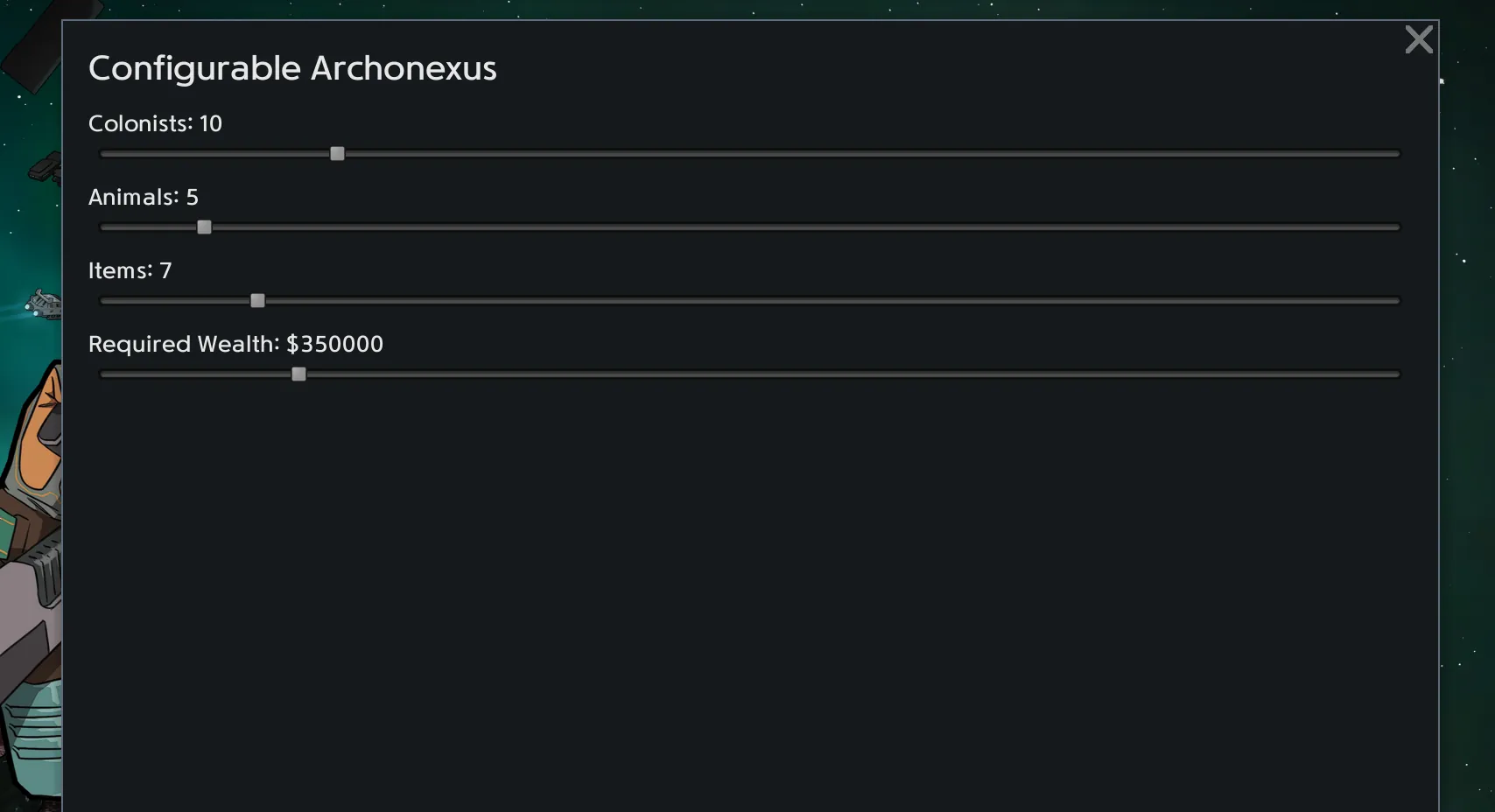 Adjustable Wealth Requirement: Set the required colony wealth to whatever fits your playstyle.