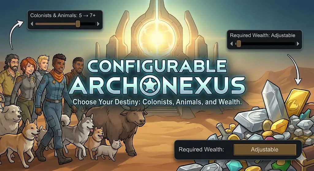 Tired of leaving your favorite pawns and animals behind during the Archonexus quest? Configurable Archonexus gives you full control over the transition requirements for the Ideology DLC's endgame.