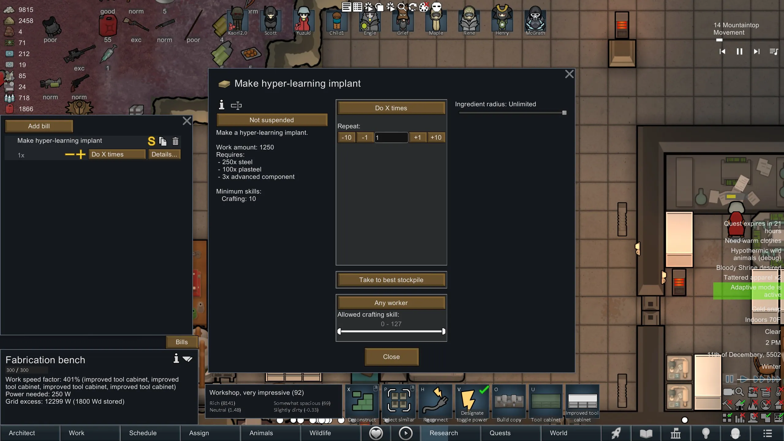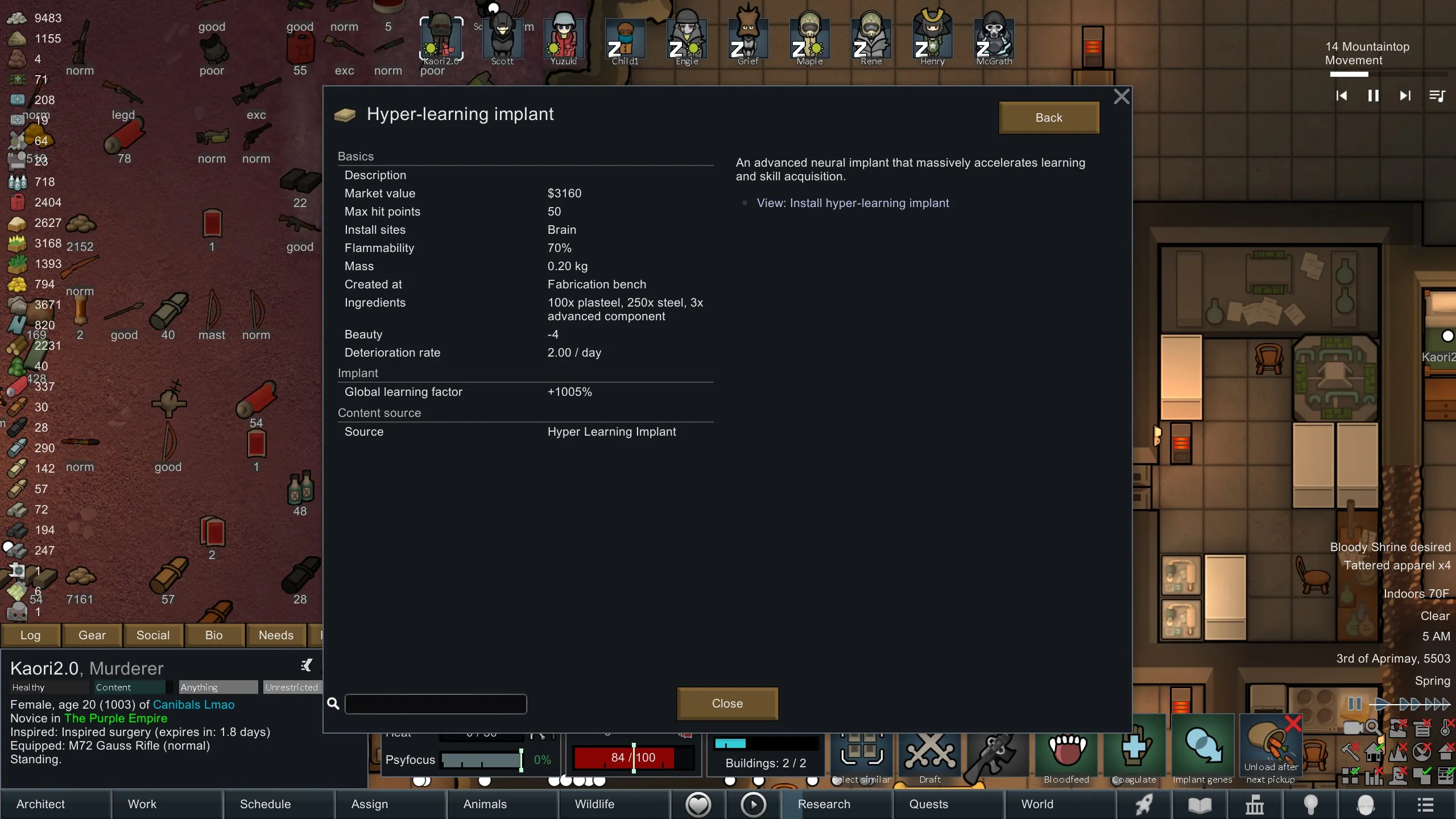 - Researchable spacer-tier implant that increases a colonists global learning speed. (Needs bionics researched first after that its found in spacer tier)