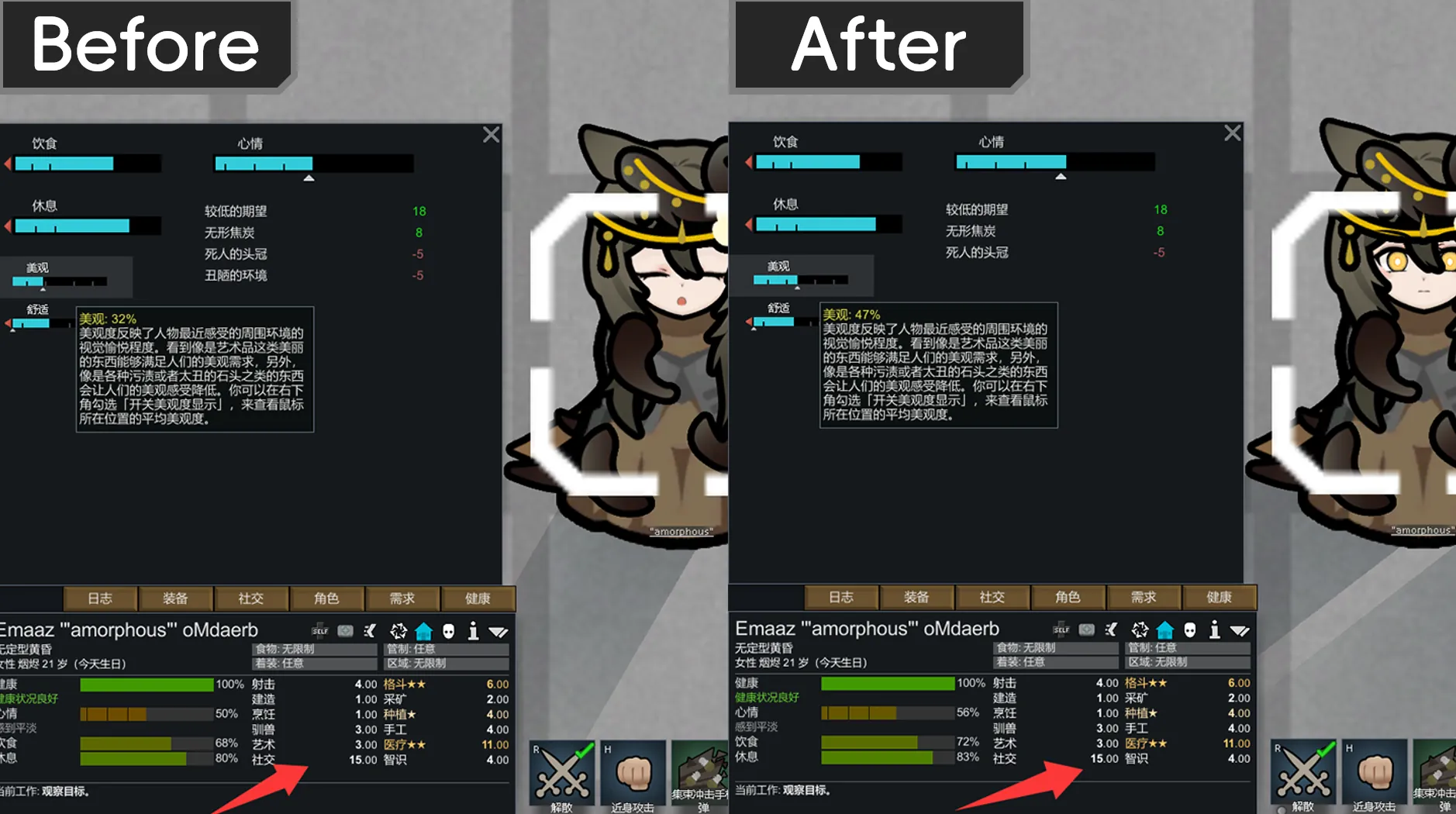 [b]이 모드의 성능 부하는 거의 무시할 수 있는 수준입니다. 모드는 캐릭터의 미관 수치를 결정하는 부분과 현재 시야 내에 있는 캐릭터들의 미관 수치를 계산하는 두 부분으로 나뉩니다. 전자는 사교 레벨이 변경되거나 Hediff(건강 상태 이상)가 변경될 때만 계산됩니다. 후자는 200틱(약 3.3초)마다 한 번씩 스캔하는데, 일반적인 "느린 검사"는 보통 150틱입니다.[/b]