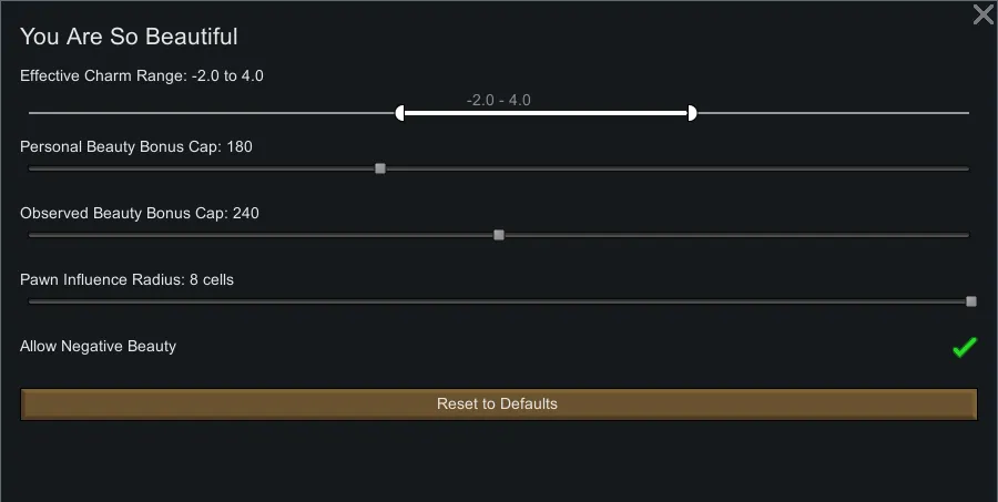 •[b] Maximum Cap: [/b]The Beauty Value gained from other pawns is capped at 240. This prevents you from stuffing a room full of socialites to instantly max out everyone's Beauty need.