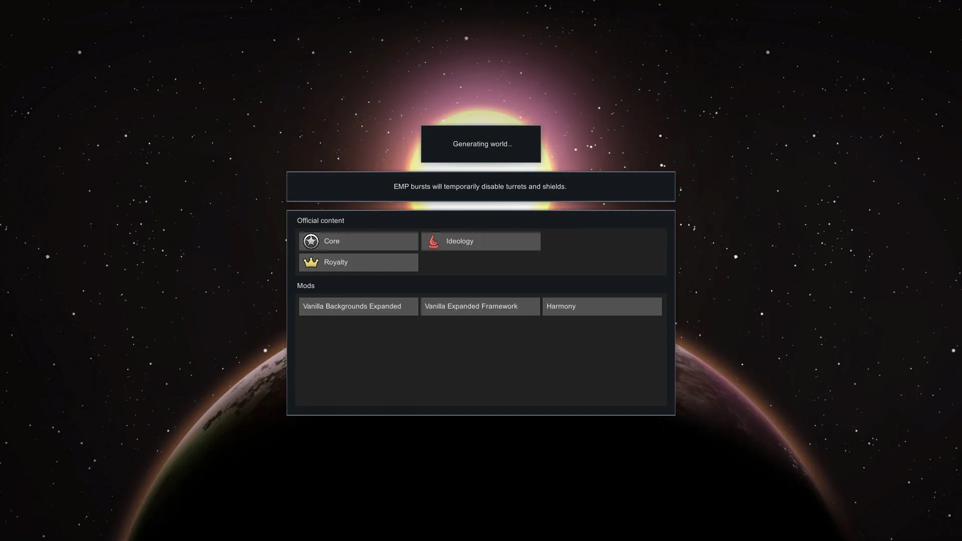 Vanilla Backgrounds Expanded is a mod that adds many new main menu and loading screen backgrounds inspired by RimWorld - all created by Oskar Potocki for the purpose of Vanilla Expanded mod series. With mod options, you will be fully able to customize what backgrounds appear in the game, whether they cycle or not, and how long should it take for them to change into other backgrounds.