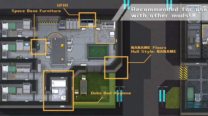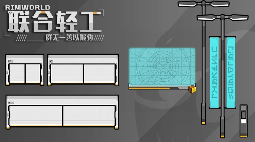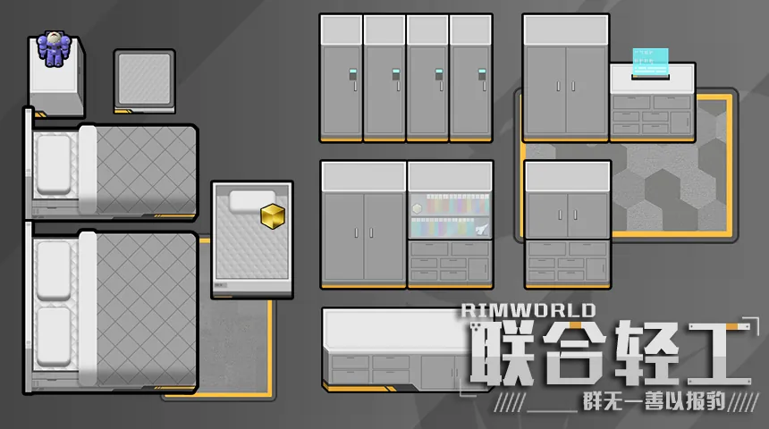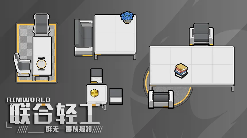 联合轻工业家具拓展以UFHI的画风为基础,提供了一系列近未来风格的家具,家具的设计参考了诸多Rimworld社区的优秀作品。