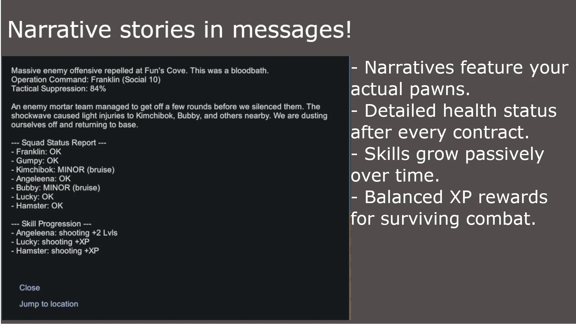 [*] [b]Immersive Combat Reports:[/b] Replaces generic result notifications with detailed after-action reports that explain what actually happened. (I want more stories and narrative!)
