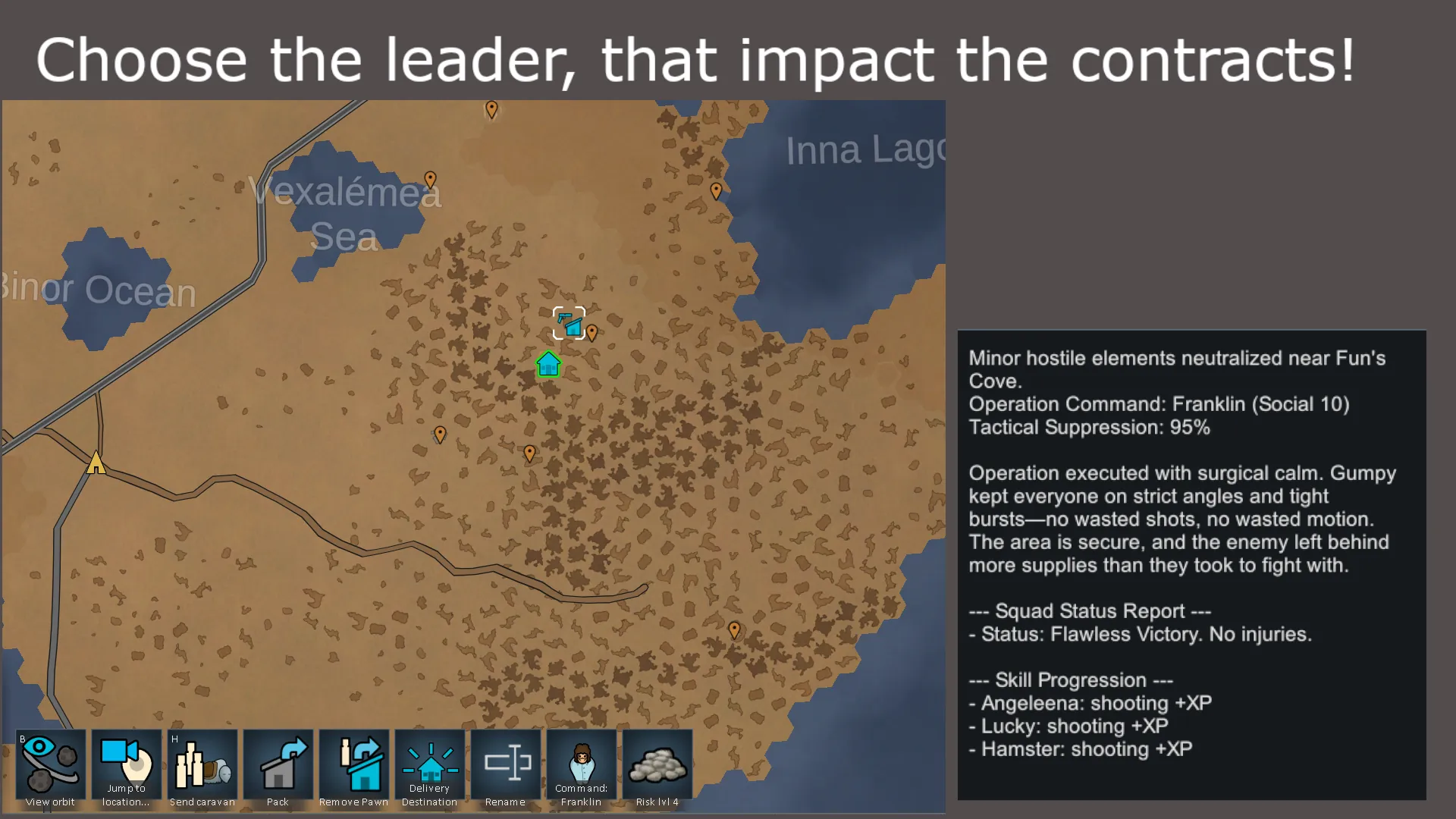 The biggest change is how contract risk and outcomes are calculated. The game now looks at what your mercenaries are wearing and wielding. A squad in full Marine armor with charge rifles will perform very differently from one sent out in tribalwear, especially on high-risk contracts. Preparing your away teams now feels like a strategic decision instead of a way to dump unnecessary pawns.