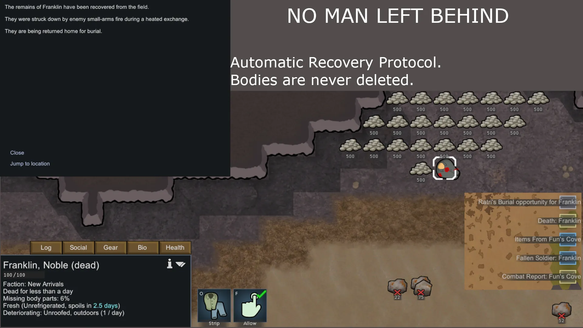 [*] [b]Corpse Recovery:[/b] Fallen mercenaries can be returned to your colony via transport pod for burial or resurrection instead of being lost forever. (I want to have dead bodies for a normal goodbye.)