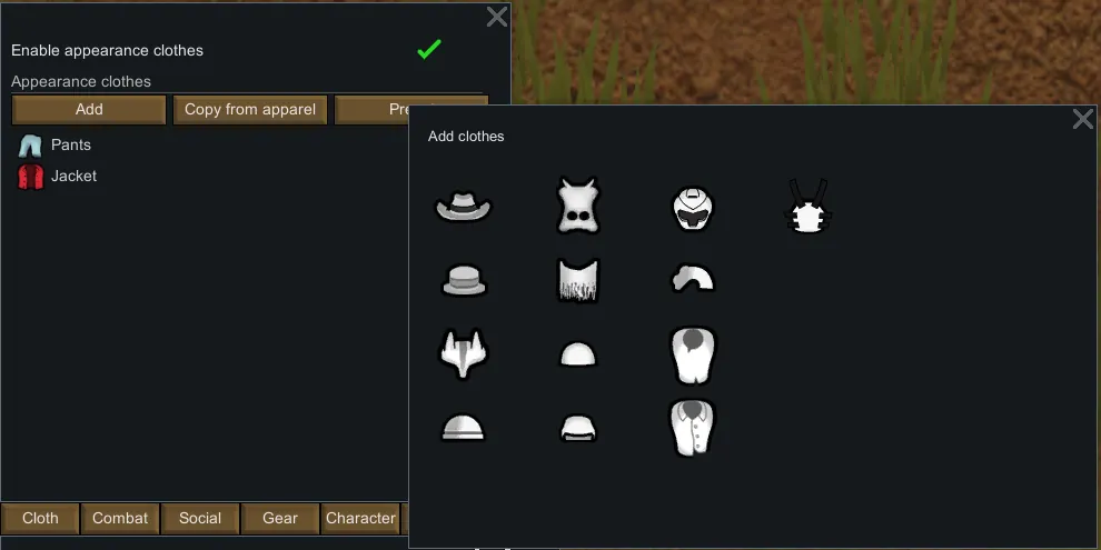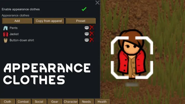 - Checkbox "Enable appearance clothes" : [u]Clothes displayed of colonists will not be current clothes(apparels, equipments), but will be appearance clothes.[/u]