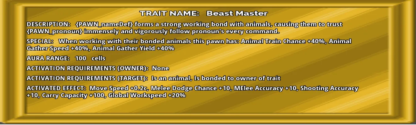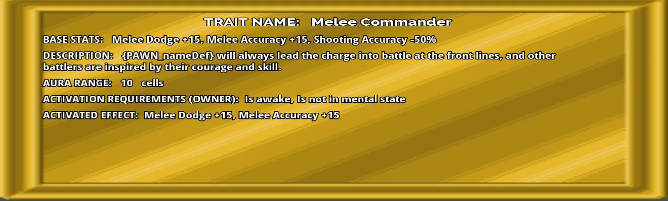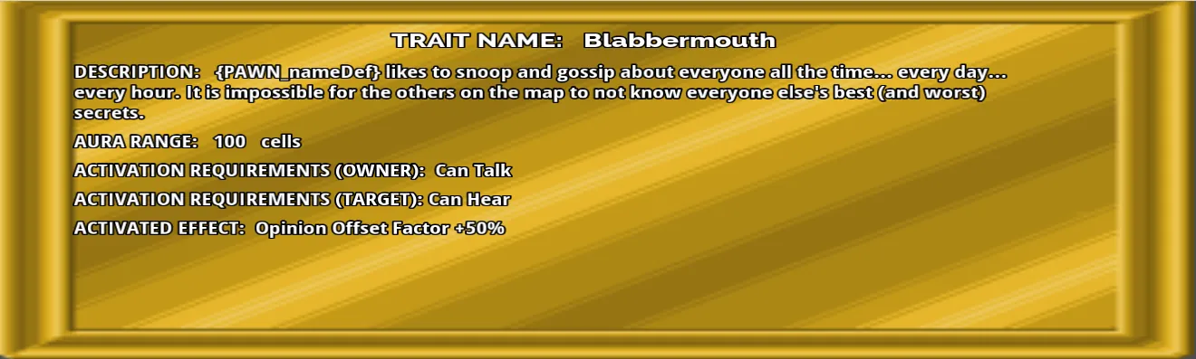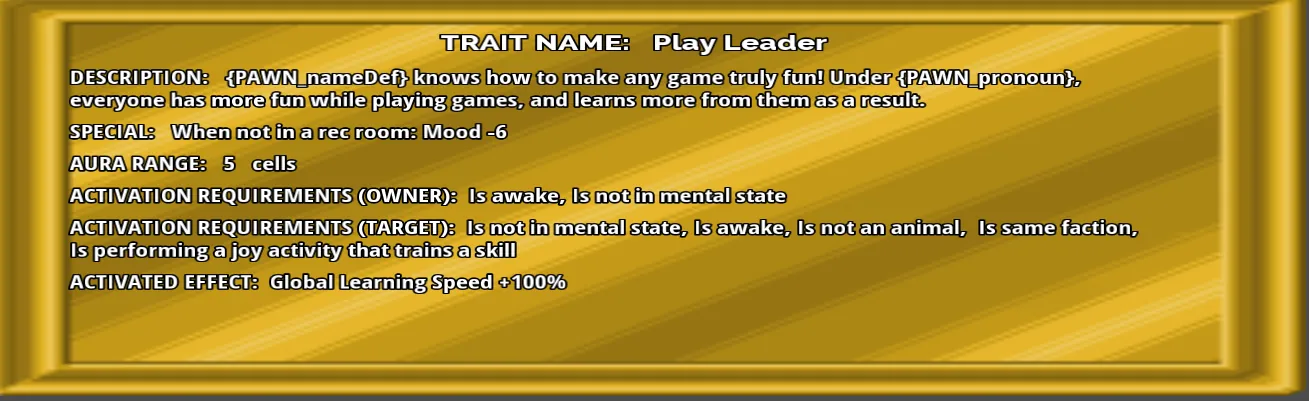This mod adds 16 traits that alter the stats of pawns near the pawns with the traits.