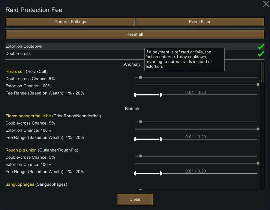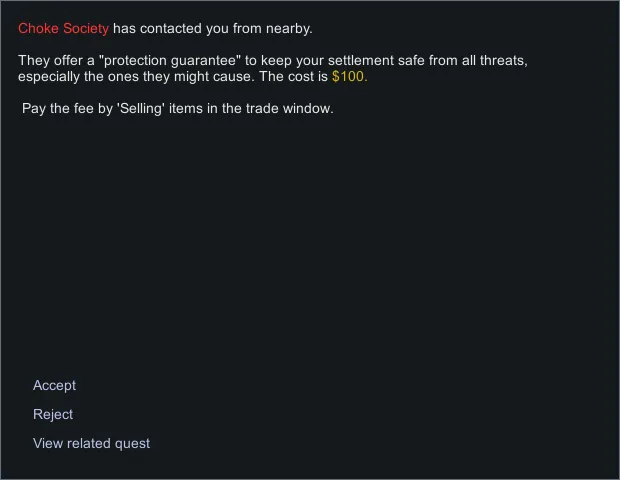 Adds a realistic extortion mechanic to RimWorld. When a raid is imminent, hostile human factions will offer a "protection fee" based on your wealth. Pay to be left alone, or refuse and prepare for battle.[/b]