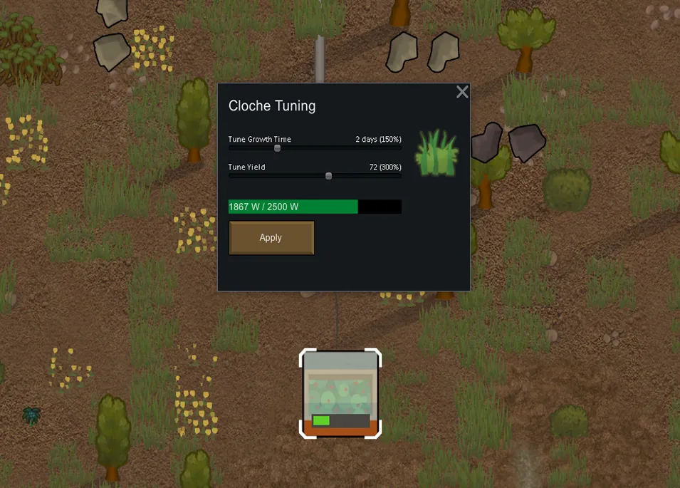 The Cloche grows crops about twice as fast as growning in soil since the crop will grow both day and night. Base power conumption is 100W. It is possible to use tune the cloche so it produces more crops at a faster rate at the expense of power draw