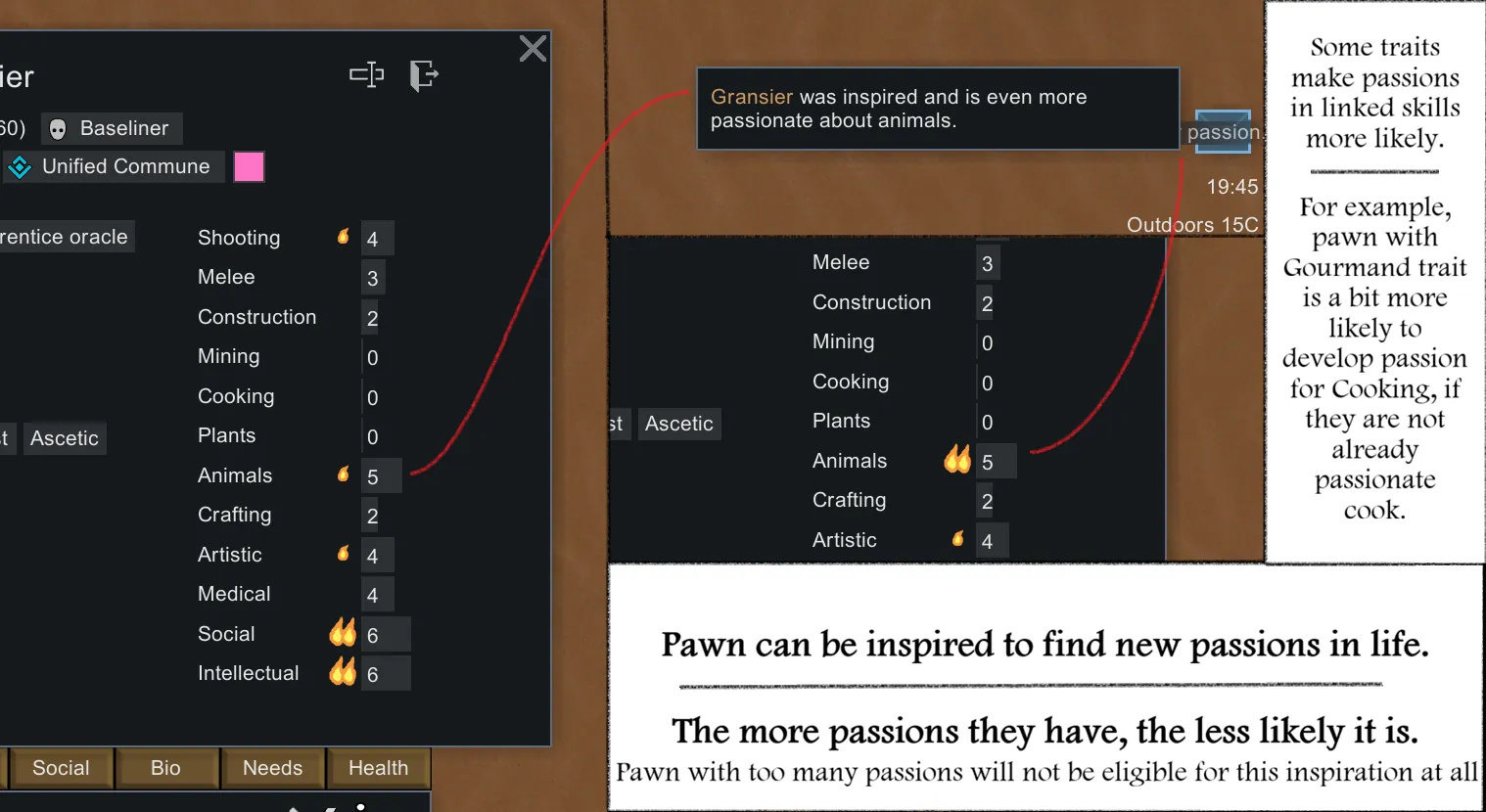 [*] New inspiration, gain new passions - inspiration that can occur to pawns with few passions. It is less likely to happen to pawns with lots of traits.