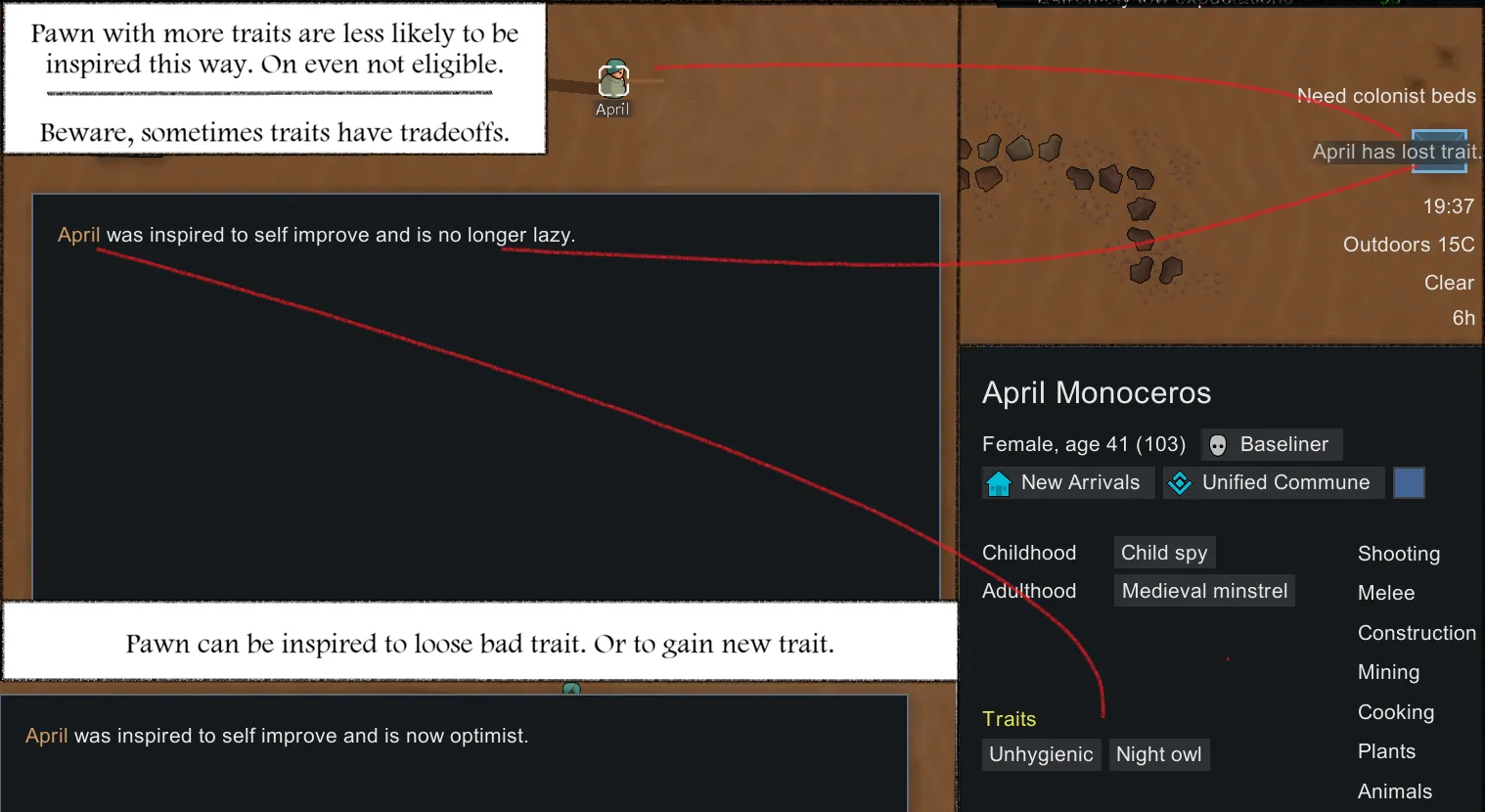 [*] New inspiration, improve traits - inspiration that can occur to pawn with negative traits or with few positive traits. It is less likely to happen to pawns with good trait.