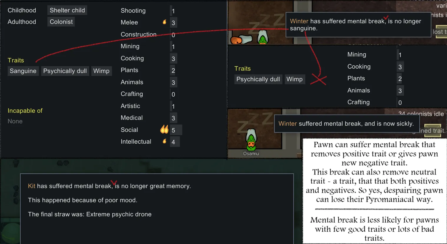 [*] New mental break, degrade traits - mental break that either removes positive trait or gives pawn negative trait. It is less likely for pawns with lots of bad traits and few good trait to remove.