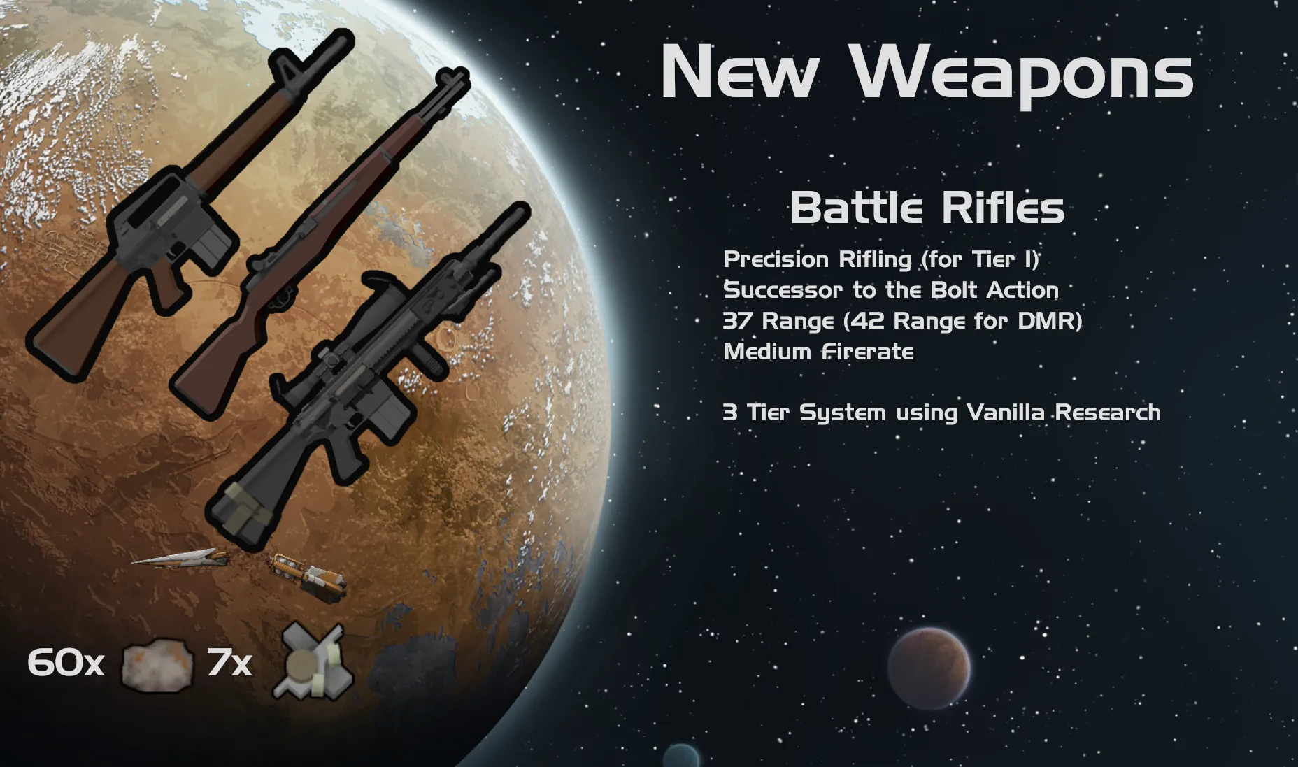 [*] New weapon types like Battle Rifles which are an extension of the bolt action rifle serving as a mid to late game long range option, bridging the gap between assault rifles and bolt action rifles. Anti Material Rifles that have bonuses against buildings making them a long range option of dealing with Mechanoid clusters since they out range inferno turrets.