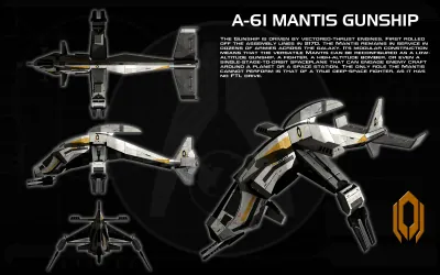The Gunship is driven by vectored-thrust engines. First rolled off the assembly lines in 2170, the Mantis remains in service in dozens of armies across the galaxy. Its modular construction means that the versatile Mantis can be reconfigured as a low-altitude gunship, a fighter, a high-altitude bomber, or even a single-stage-to-orbit spaceplane that can engage enemy craft around a planet or a space station. The only role the Mantis cannot perform is that of a true deep-space fighter, as it has no FTL drive.