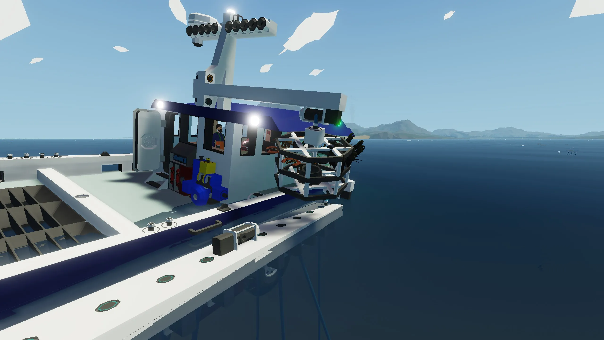 If you are opting to use the beam pots provided: Hook each end of the beam into the smaller winches on the side of the boat, then just hook the pots into the crane. Use "signal to winch" to dump the pots