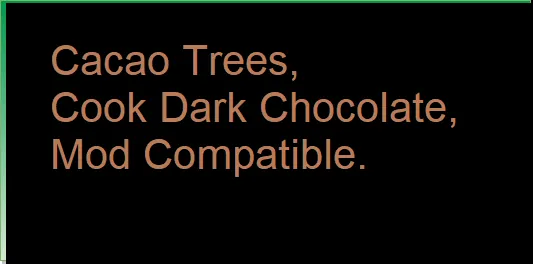 New Cocoa Tree 'Theobroma cacao' from Earth is farmable for Raw Cocoa Beans, which can be crafted into Dark Chocolate at a Stove.
