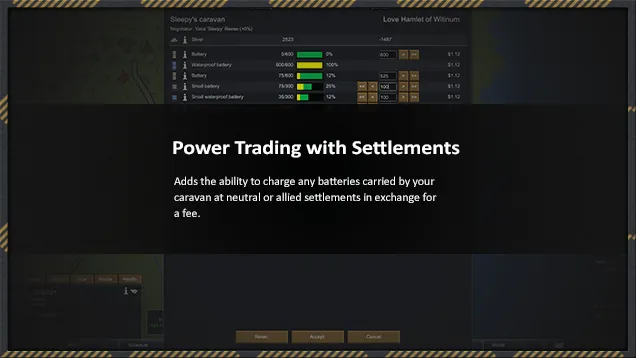 Another feature added by the Mod is the ability to charge any batteries carried by your caravan while visiting any neutral or allied faction base, in exchange for a fee.