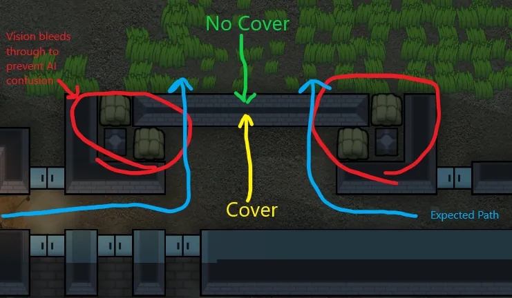 Walls: Less path cost and easier to walk over, can also be stood on. While standing on it, you must be near the edge of the wall to shoot off of it, however, edges provide no cover to those standing on them. There are no ranged bonuses from firing from a wall, other than having a safer and smoother retreat.