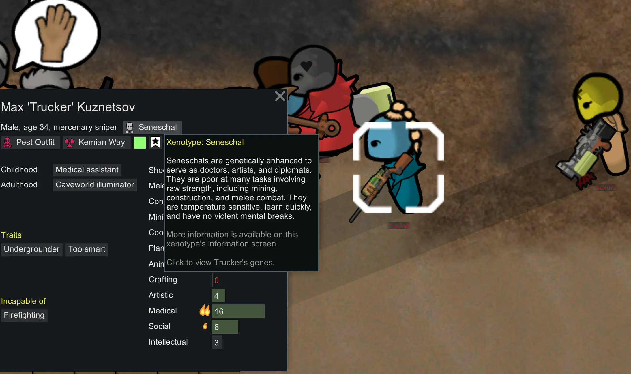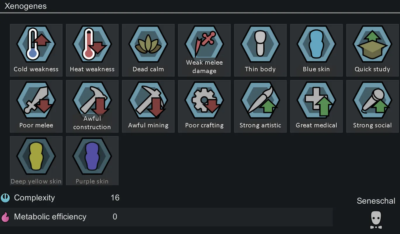 Seneschals are a variant of the Genie xenotype. They learn fast and have bonuses to Medical, Artistic, and Social skills. Seneschals suffer penalties to Mining, Construction, Crafting, and Melee Combat due to their low physical strength, and are sensitive to extreme temperatures.
