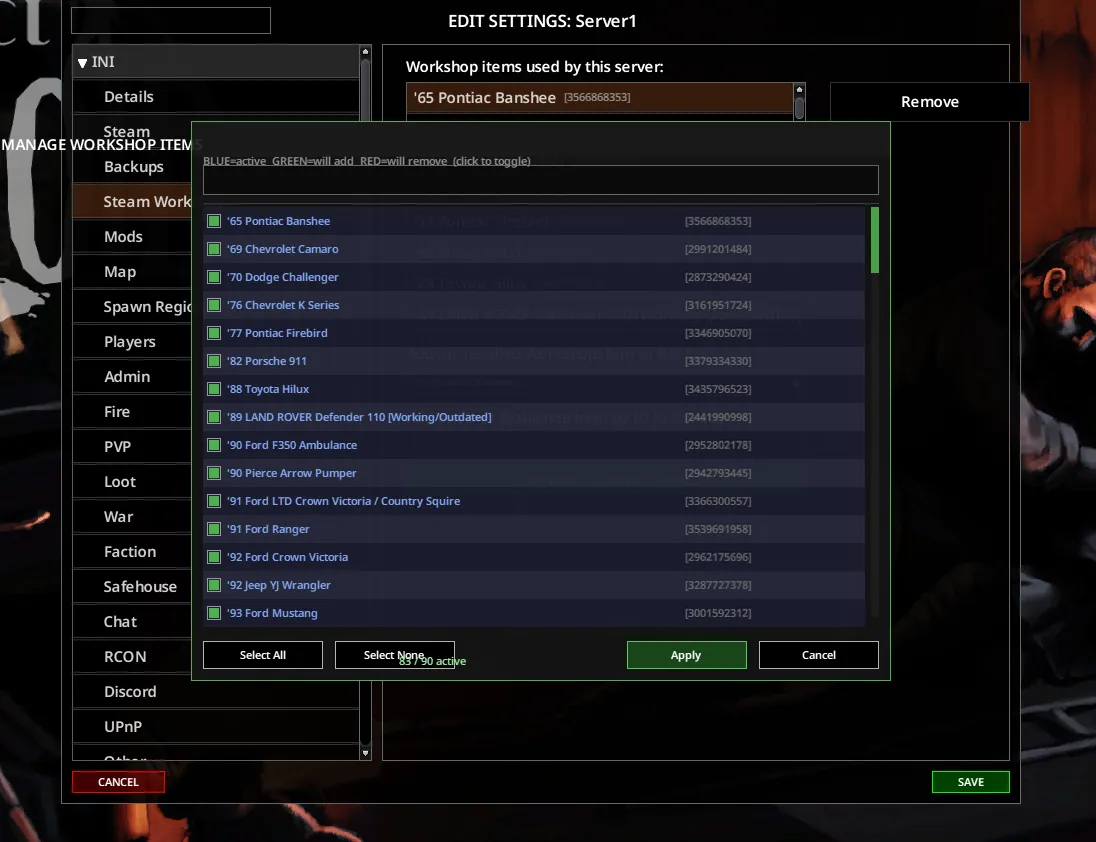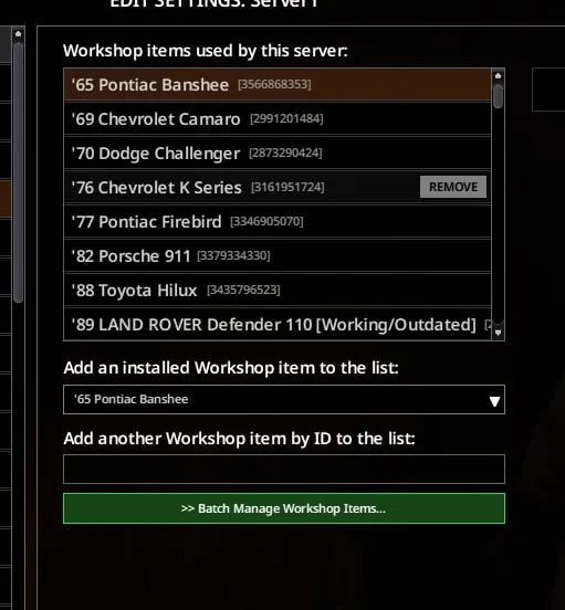 Tired of adding workshop mods to your server one by one? This mod adds a [b]Batch Manage Workshop Items[/b] button directly in the server settings Workshop tab.[newline][newline]