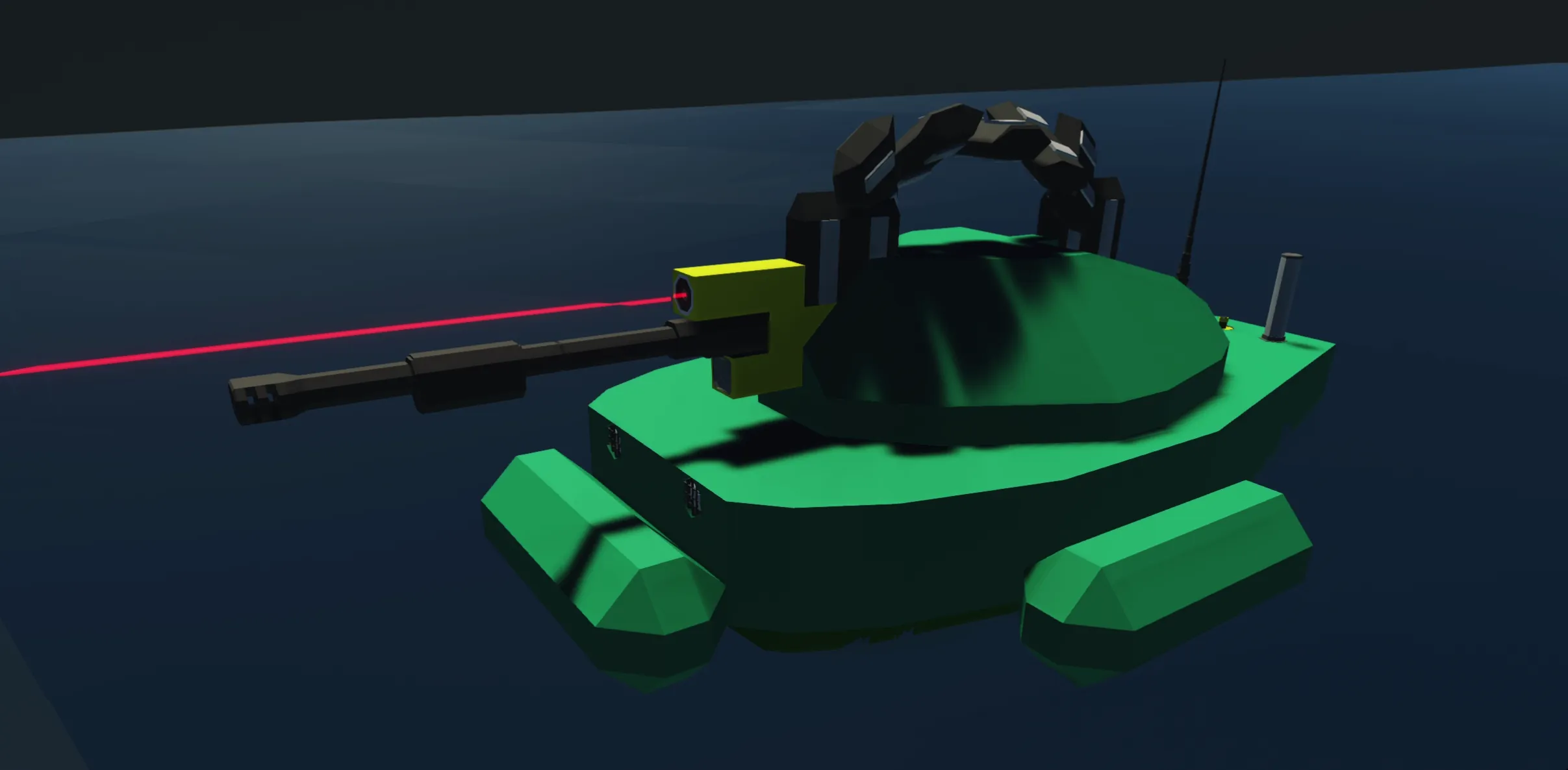 This is the UPV, an unmanned patrol boat. Using fragmentation rounds in 2 different magazines with a heavy autocannon as its primary weapon. It relies on its speed and power, without the stationary operating hub or the antennas on its back its useless(of course it comes with the hub so no worries.) Instead of putting a big boat and yourself on the frontline, fight from the back in the UPV Fighting vehicle.