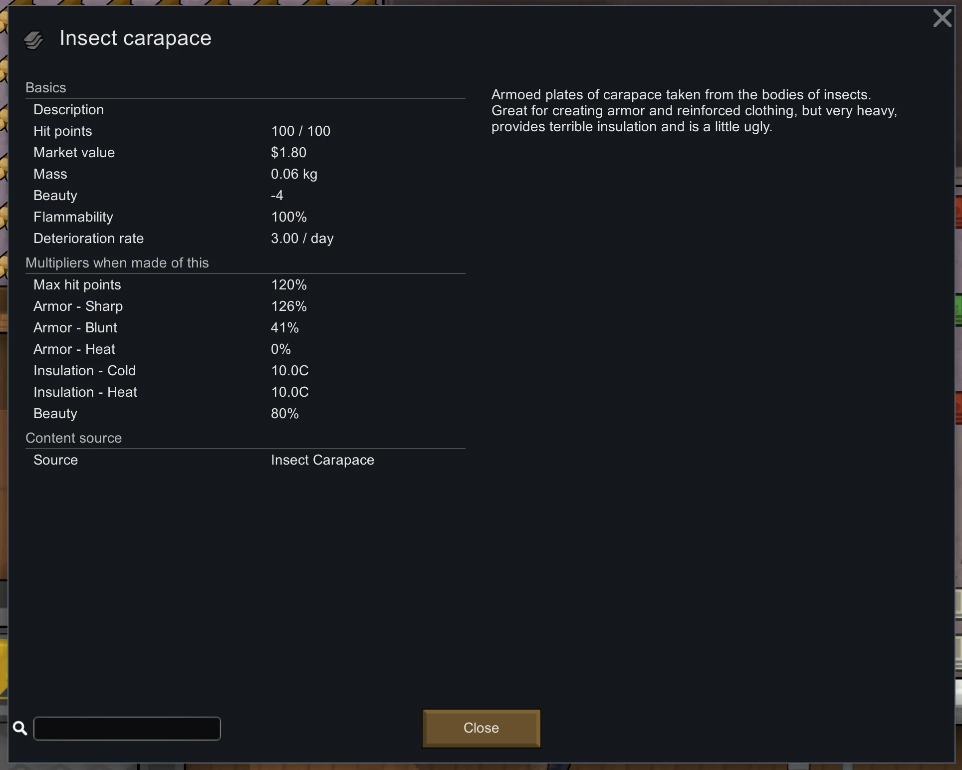 Introduces Insect Carapace - a type of "leather" used to craft armored clothing with. Gives you actual usable loot from an insect invasion other than useless meat and jelly.