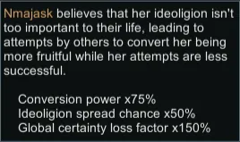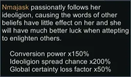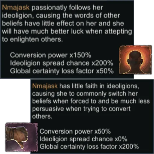 Adds four new traits (Zealous, Devout, Skeptical, and Cynical) to define how closely someone follow their ideoligion, affecting their conversion power, chance to spread their ideoligion, and certainty loss factor. Image uses the trait icons from Crusader Kings III, which is what inspired me to make this.