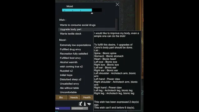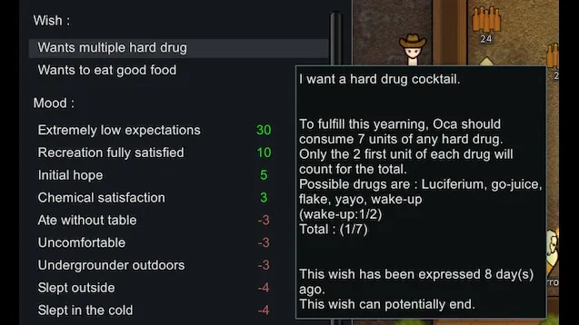 This mod gives wishes to your colonists, these wishes appear over time, they have a determining factor on your colonists's moods. As the comfort of your colonists progresses, their wishes also become more complex.