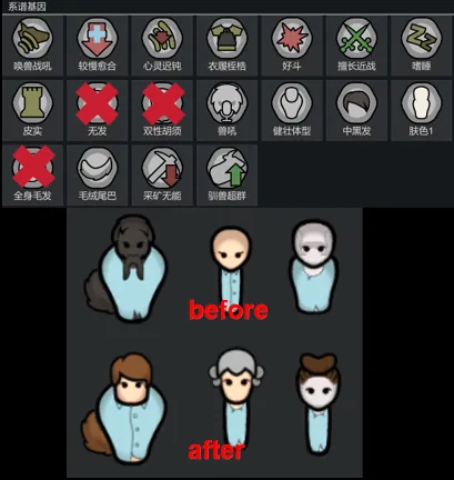 Removes the baldness and facial genes, body type genes, full-body fur, and unisex beard genes from Biotech's Genies, Starjacks, and Yttakins — save your eyes. Obviously requires the Biotech DLC. (PS: Is a Yttakin without fur still a Yttakin? Come on, I just want to see some hair.)