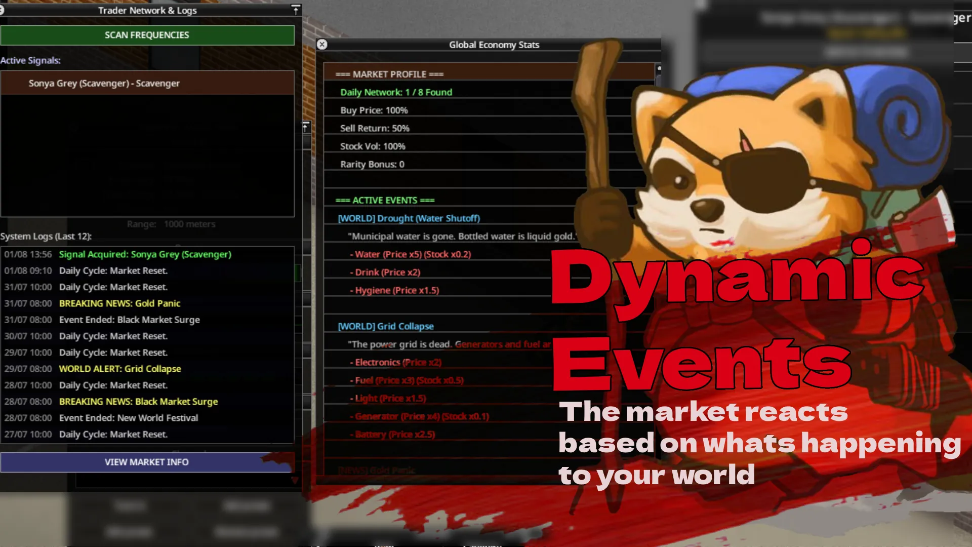 Transforms Project Zomboid’s economy into a living, breathing market. Prices fluctuate, traders move, and world events dictate value