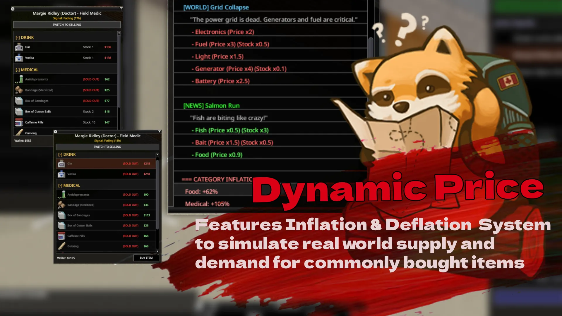 [*] [b]Living Economy & Smart Pricing:[/b] A sophisticated tag-based pricing engine handles inflation and deflation. Item condition, rot, fluids per liter, and randomized durability all directly affect true market value.