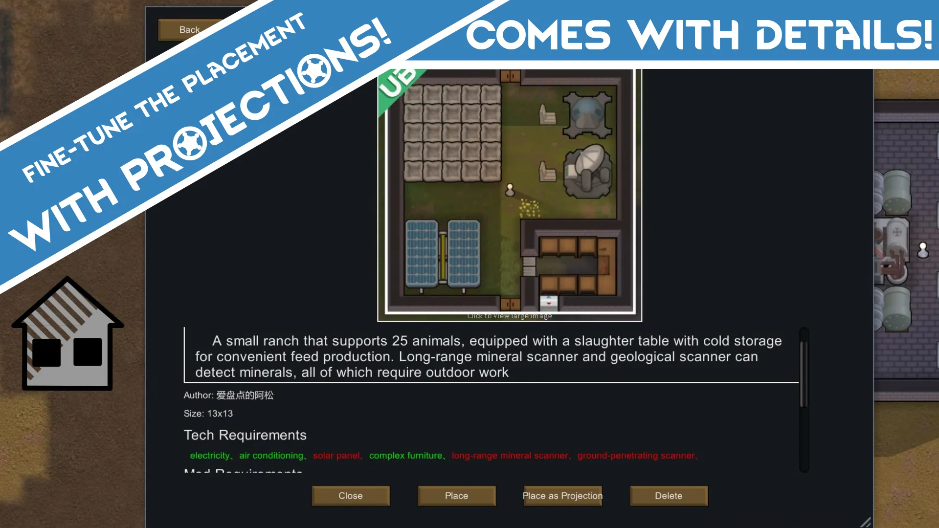 4) Click the blueprint image to enter the details page, view blueprint details, and choose "Place" (place the blueprint; directly place buildings in God Mode) or "Place Projection" (place the blueprint as a projection).