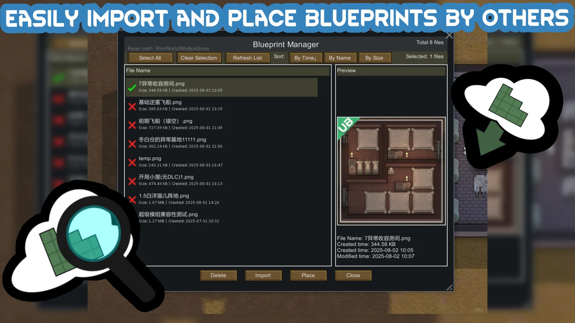 • Unique Import System: Import buildings from images exported by other players' mod shares