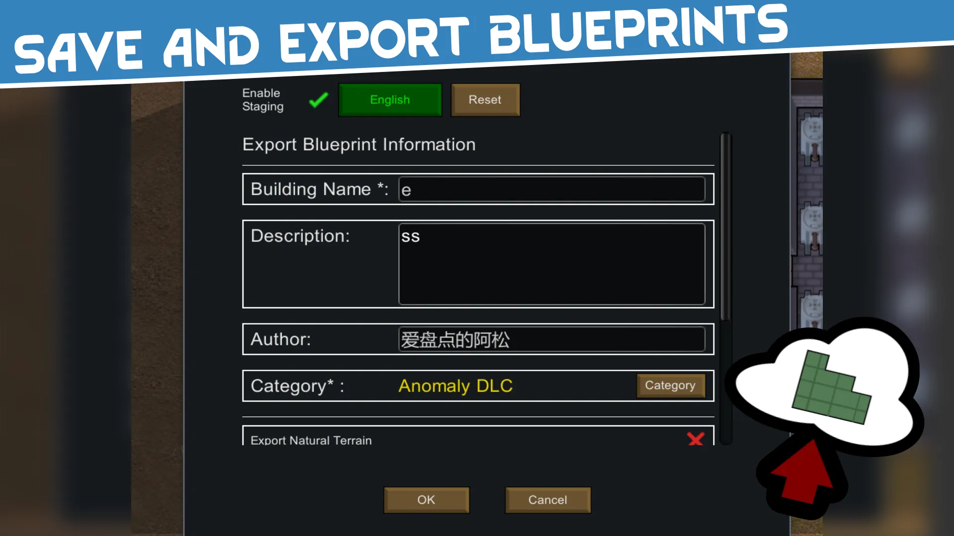 Select an area to export buildings, and export XML data and images simultaneously, merged into a single PNG file for easy sharing. Supports all modded buildings, recording complete data such as 4-layer terrain data, building information, and roof information.
