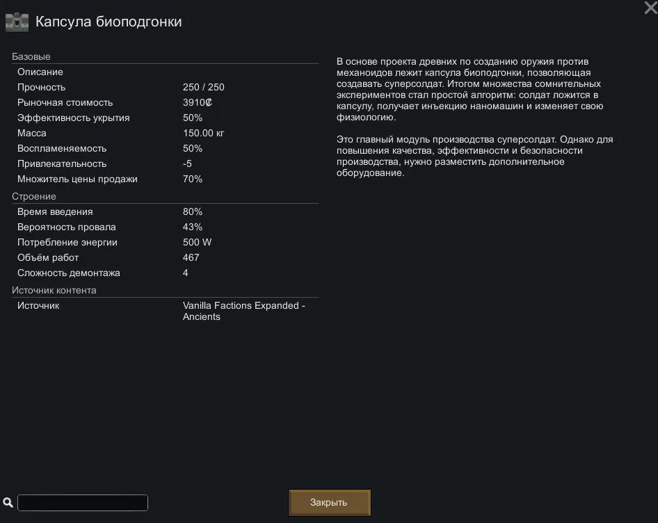 Данный мод приоткрывает завесу тайны над загадочными древними, которых вы находили в саркофагах криптосна. Теперь в мире можно обнаружить запечатанные убежища древних, взломать их и первыми столкнуться технологиями и опасностями древних. Одна из самых любопытных технологий древних позволит собрать комплекс построек для проведения экспериментов с таинственными супернанитами, способными сделать из ваших поселенцев суперсолдат. Или убить.