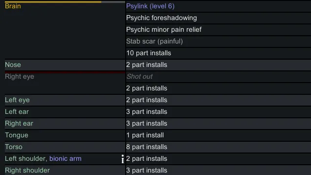 Makes the health tab show body parts that can be modified with an operation, either with an implant (e.g. elbow blade) or by replacing (e.g. bionic eye).