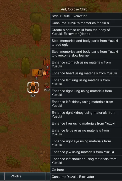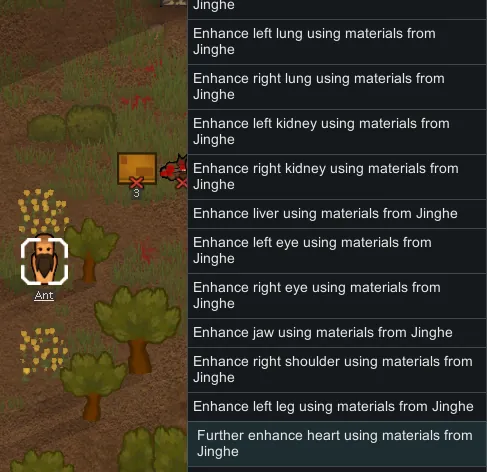 A third set of enhancements can be crafted after learning a new tech. This new enhancement requires the corpse child to have the second level enhancement on a body part, and will remove the desired body part and the brain from the donor pawn. Adding an enhancement in this way causes major damage to the donor beyond the extracted body parts, which may render additional body parts unusable.