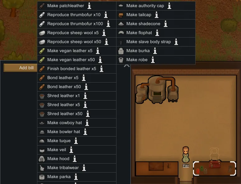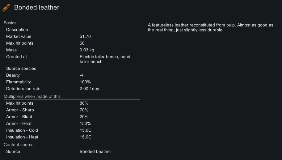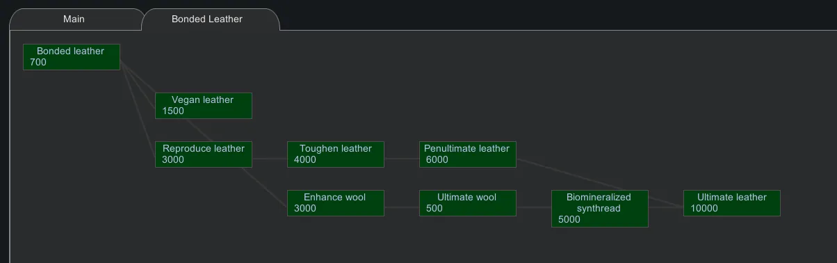 This mod adds the ability to reprocess leather and wool into higher quality versions. It starts off by adding in the ability to create "bonded leather" as an alternative to patchleather, although with more steps and a higher cost. The research branches out into further leather and wool options from there.