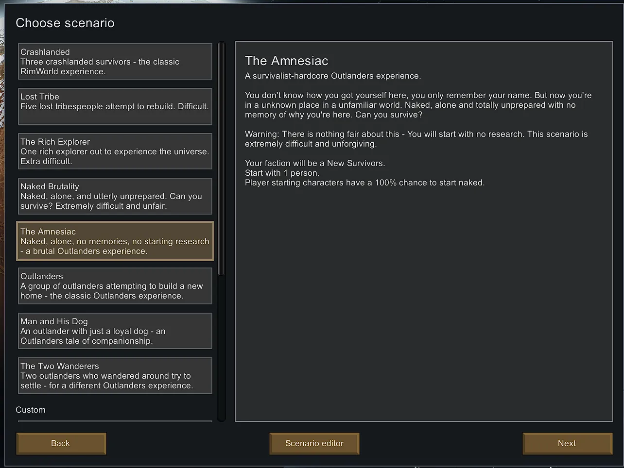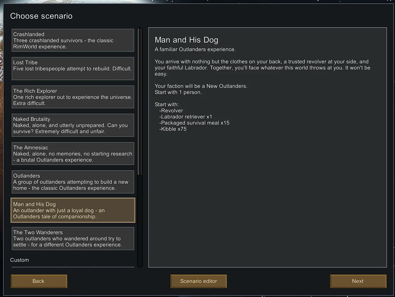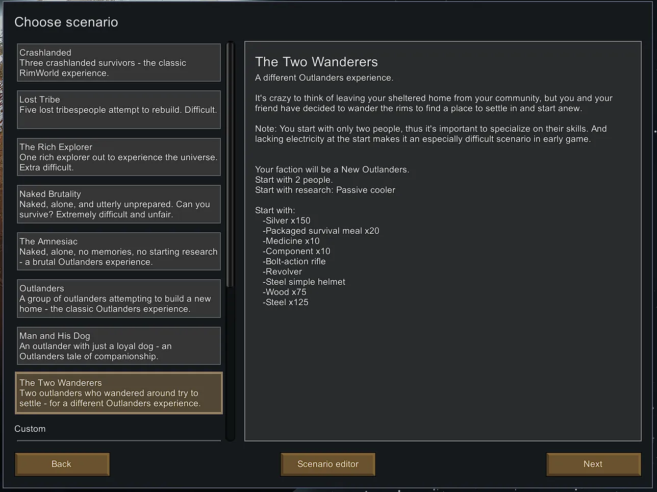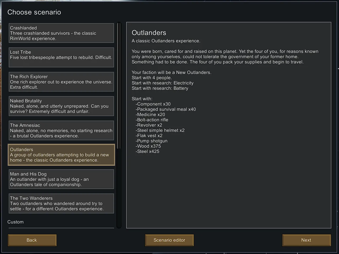This is a continued and updated version for RimWorld 1.6 of Kirby’s original mod "Playable Outlander Settlers", with an additional scenario and a few balance tweaks intended to make them slightly harder.