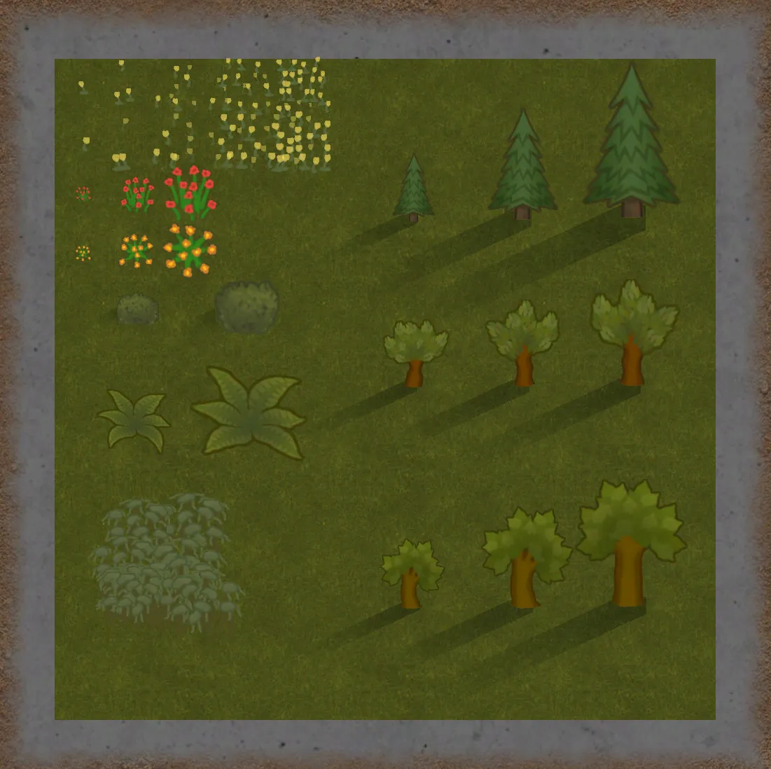 Each plant and tree has multiple variants based on how big it can grow and if it can have multiple plants on same tile.