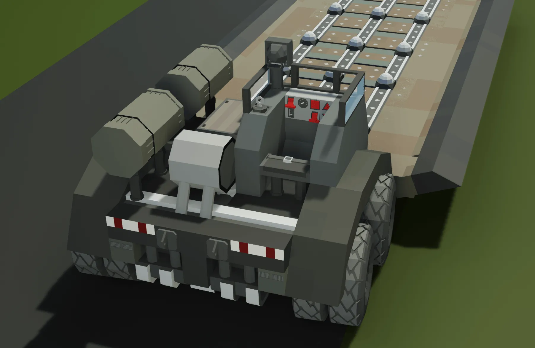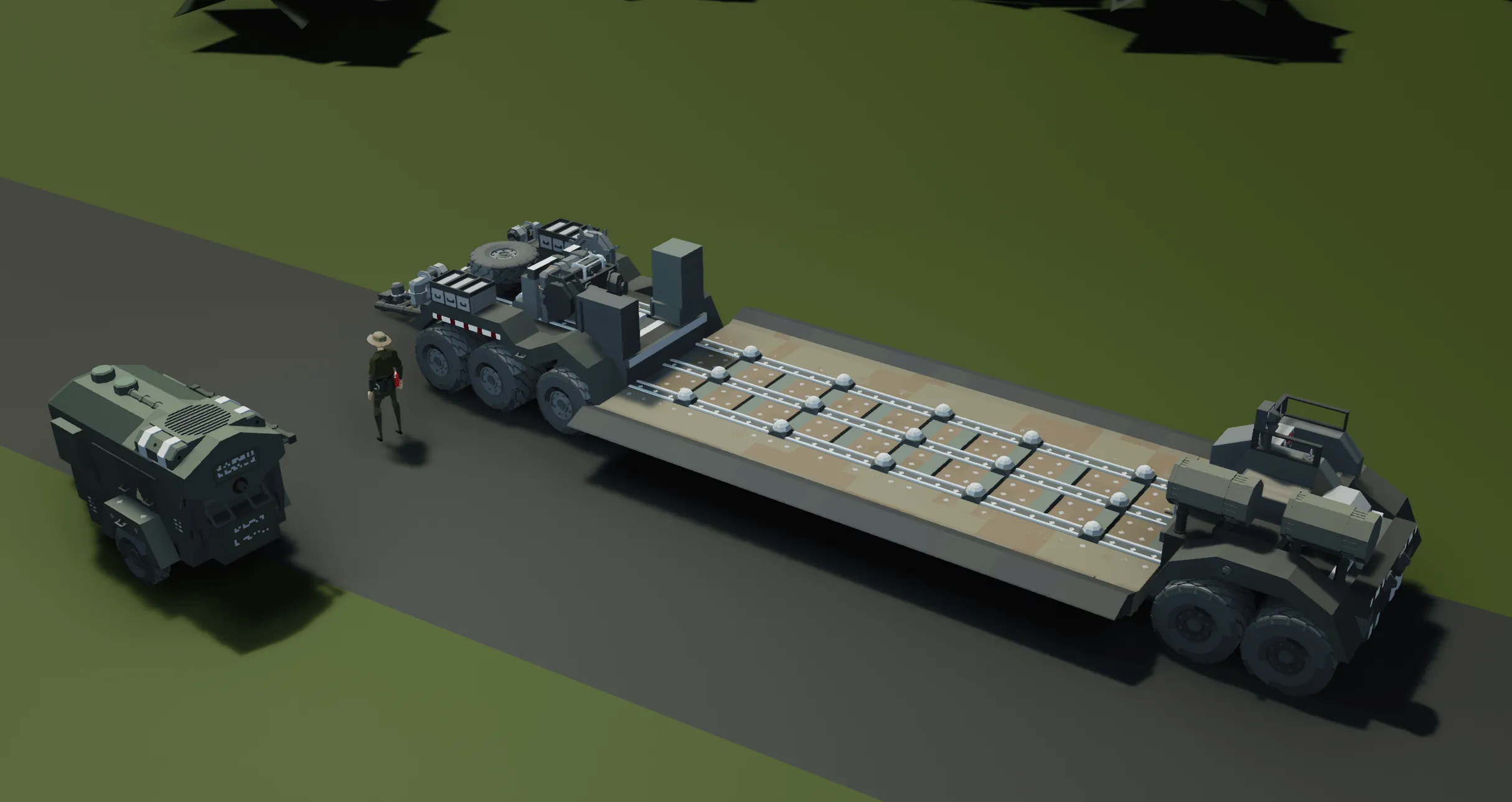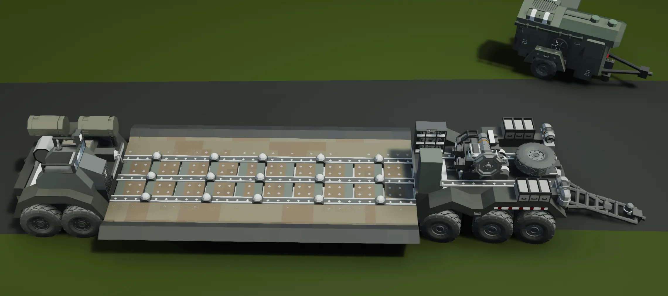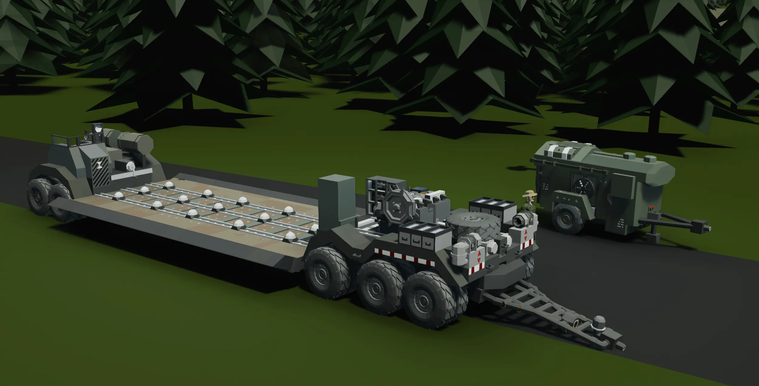 The Tank Transport Trailer is made for the PF M4 sherman tanks, but can also carry various Light tanks such as the M23 Stalward. Its meant to be towed by the M15A1 Halftrack, but the M14 Halftrack and M11 2.5ton Truck can also do the job, but less efficient. The M15 Halftrack also has electrical lines that need to be connected (these connections are colour coded in lime green and pink)