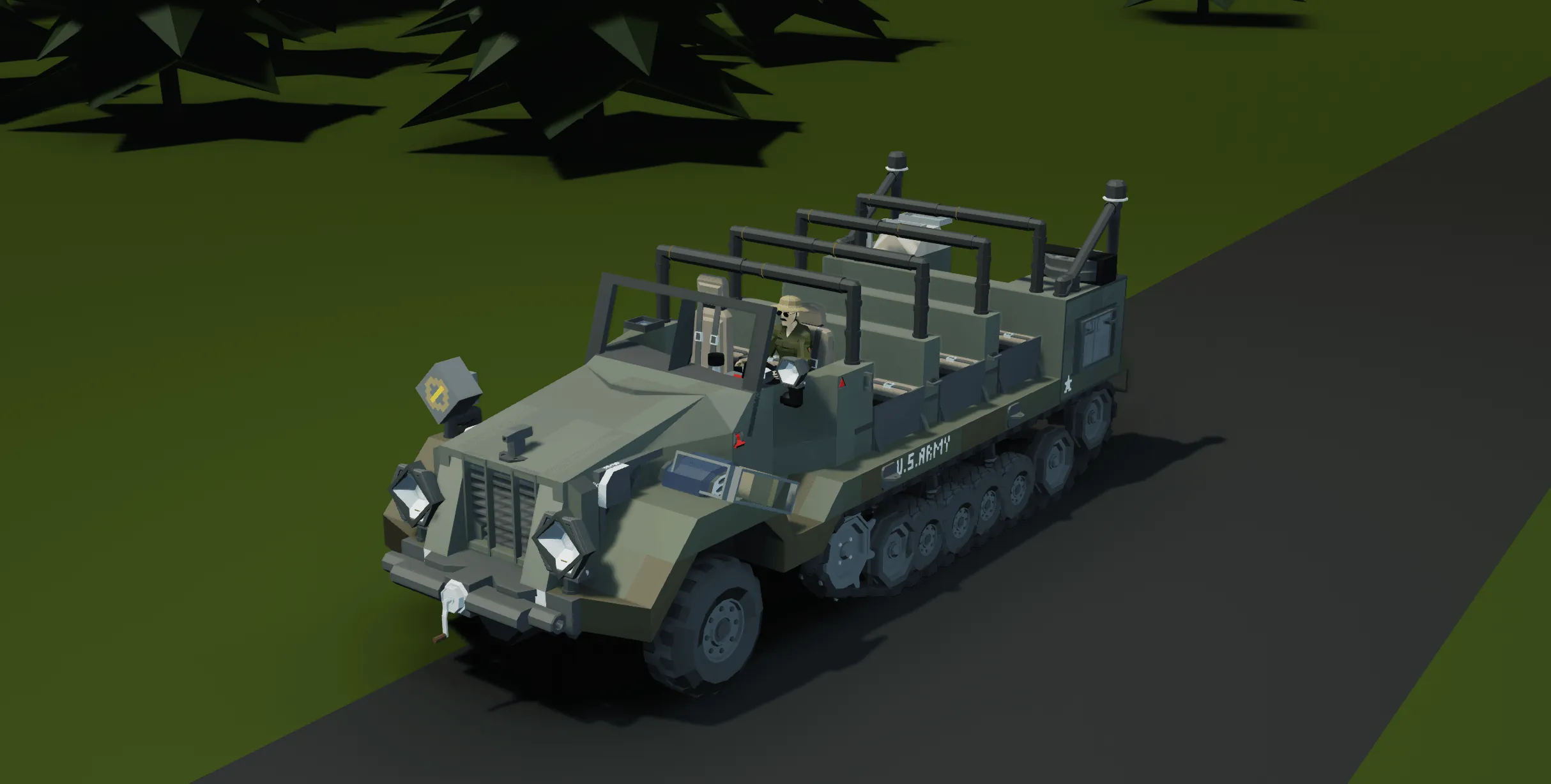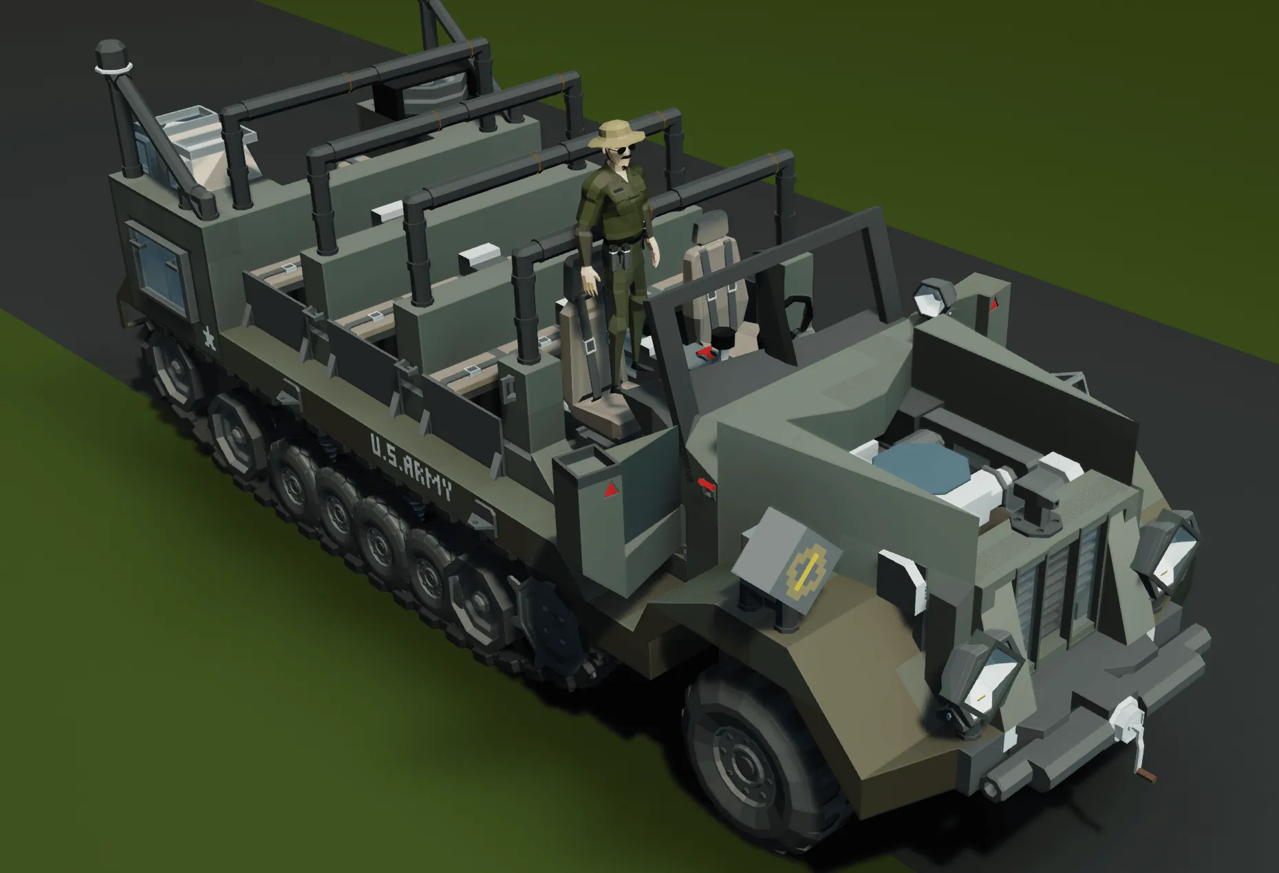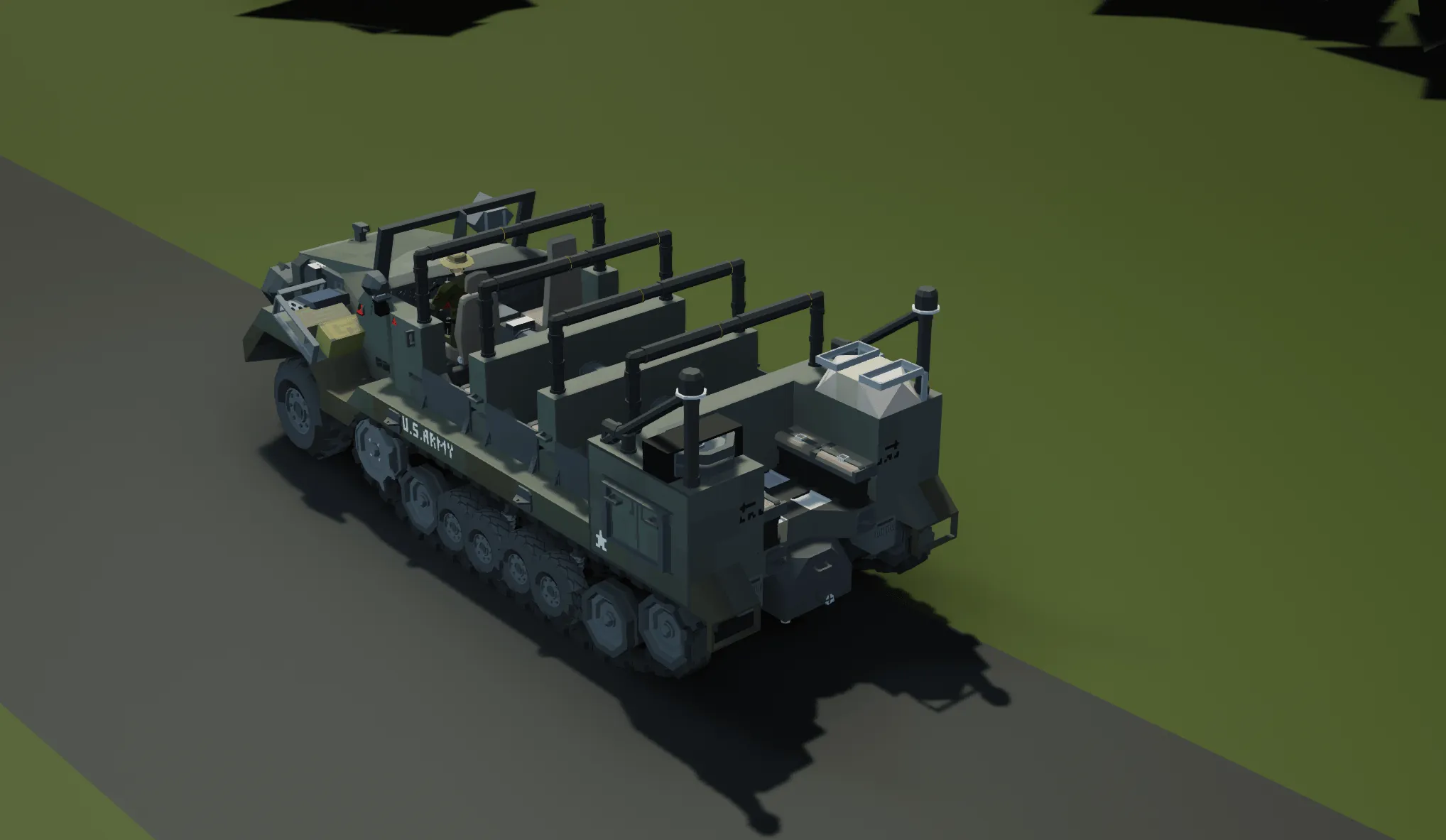 Unlike lighter utility halftracks, the base M15A1 came equipped with rows of bench seating and was optimized for troop transport, meaning it required trailers to carry cargo. It being an open top vehicle and rather large in size made it an easy target for airstrikes, and the vehicle proved vulnerable during early campaigns. Later models were retrofitted with pintle-mounted machine guns for basic defence against aircraft and light ground threats.