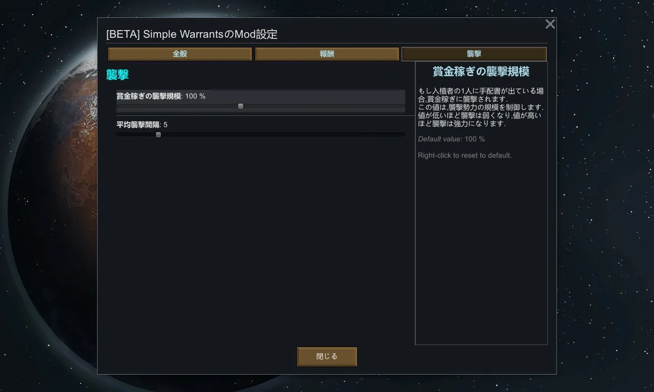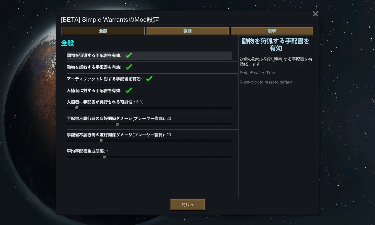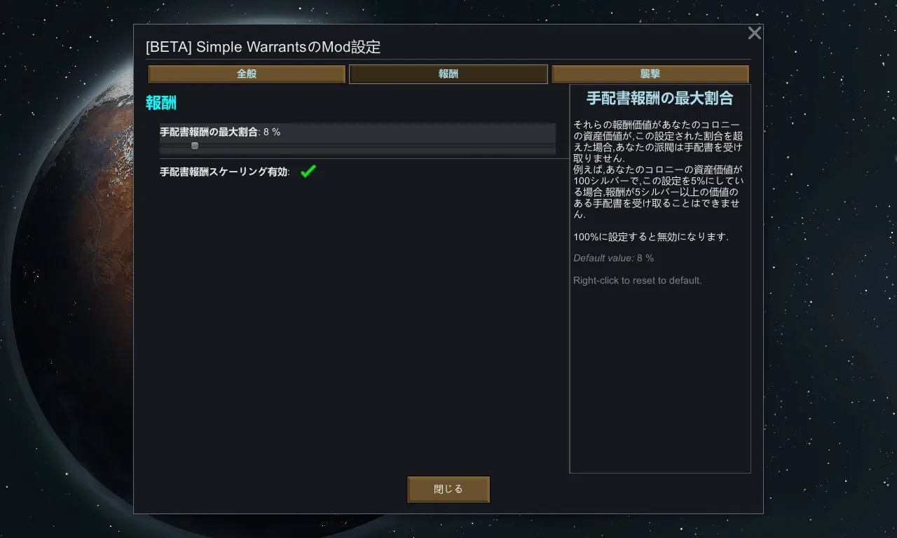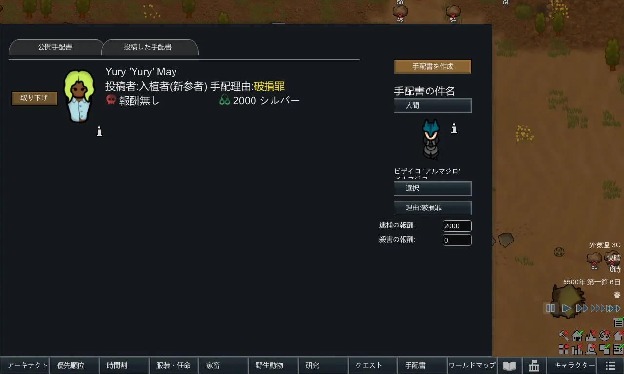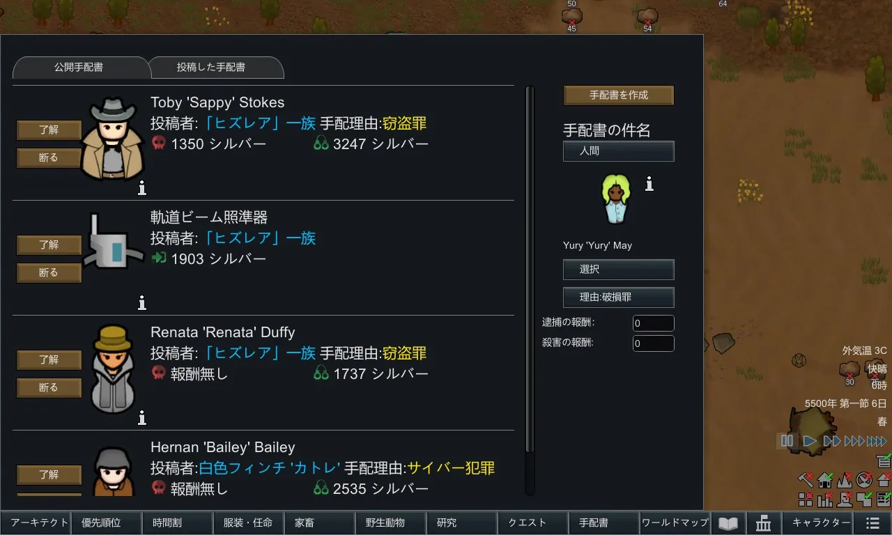 プレイヤーの入植者に依頼された手配書の賞金を賠償する能力