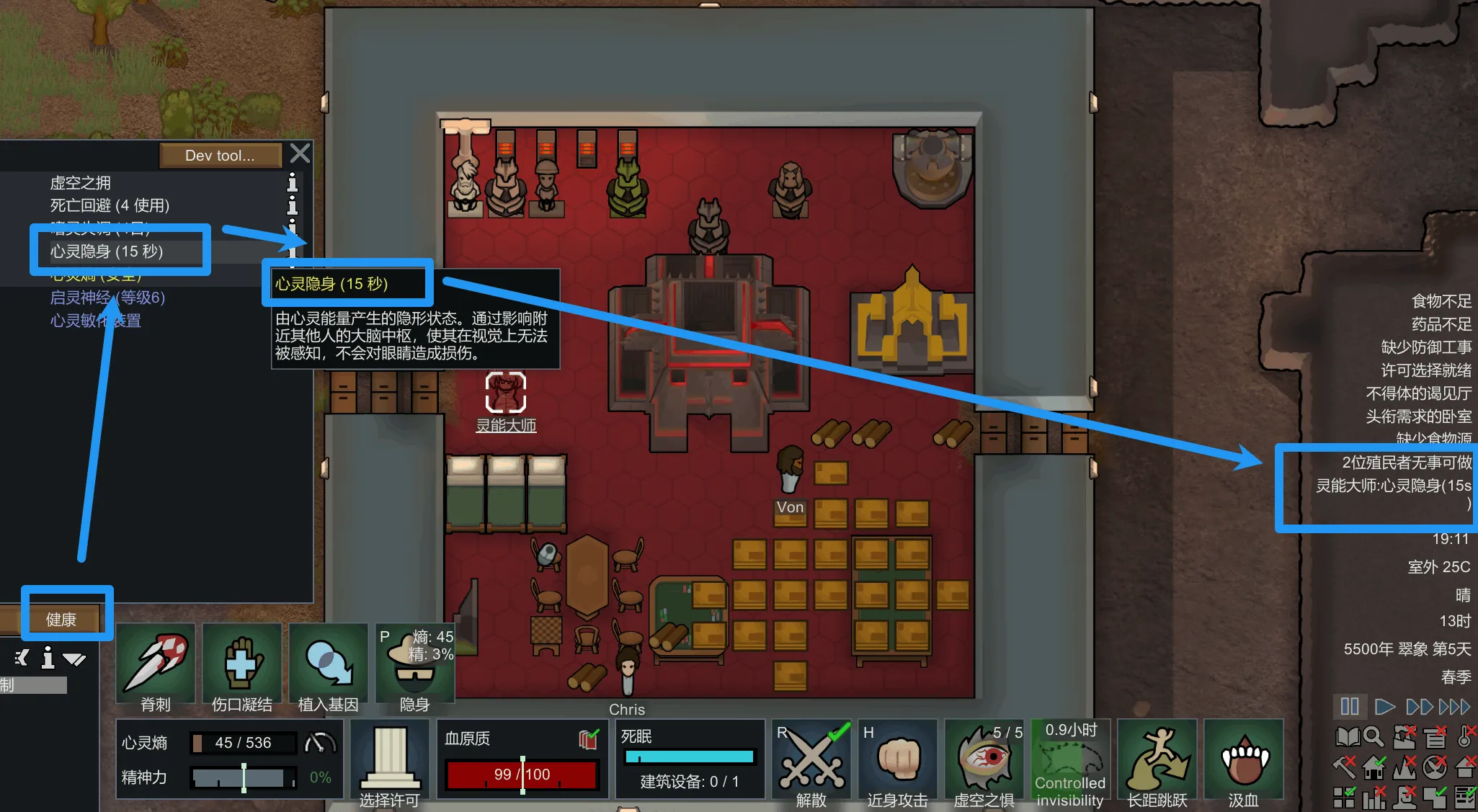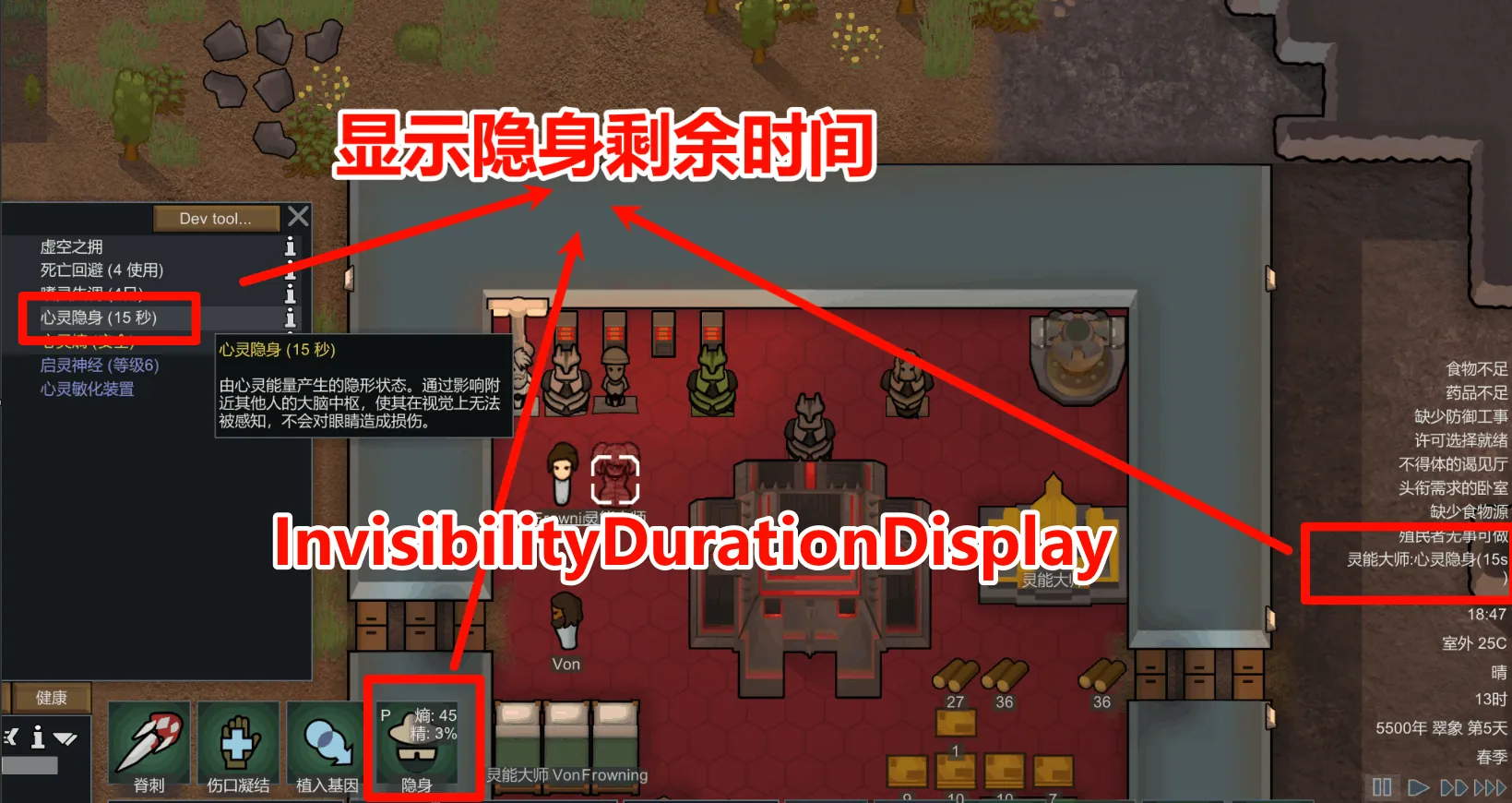 当殖民者处于“心灵隐身”状态时,在右侧通知列表中显示其剩余隐身时长(秒)。