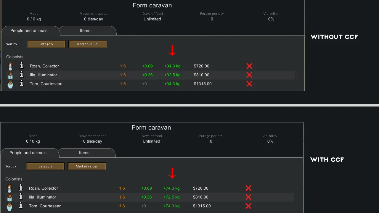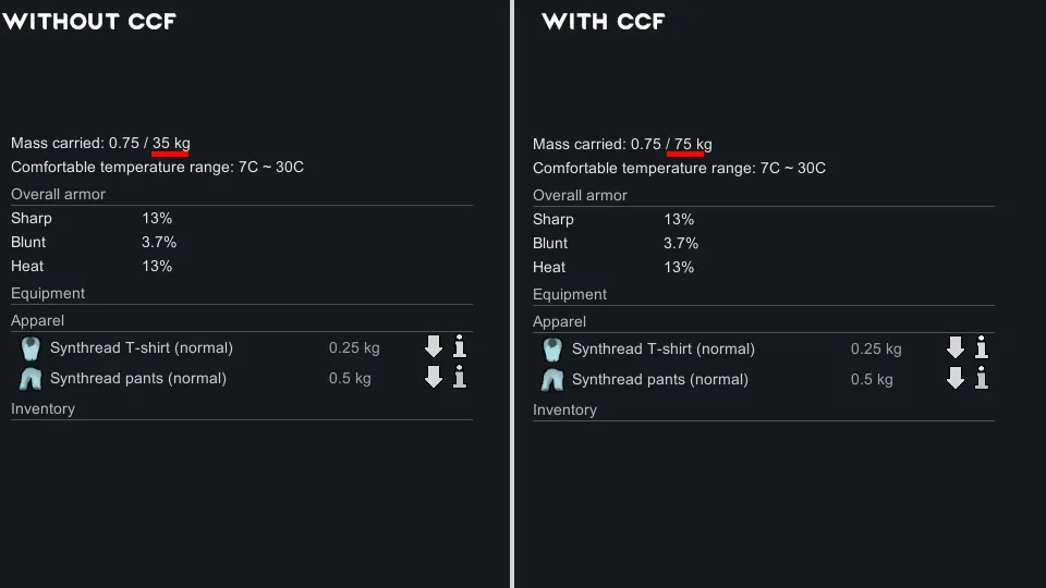 The behavior of carry capacity for pawns is 35 kg multiplied by a body type multiplier. This mod aims to change that. Pawns will now be able to hold more in inventory, as well as increase caravan capacity. This mod effects animals and colonists.