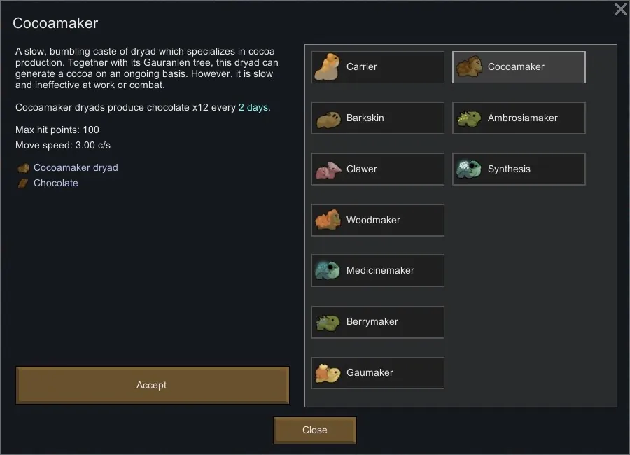 The cocoamaker dryad is a reimagining of the woodmaker dryad as a producer of chocolate. It produces x12 chocolate every 2 days.