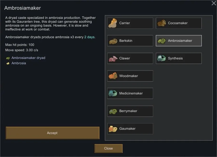 The ambrosiamaker dryad is a reimagining of the berrymaker dryad as a producer of ambrosia. It produces x3 ambrosia every 2 days.