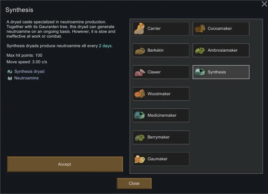 The synthesis dryad is a reimagining of the medicinemaker dryad as a producer of neutroamine. It produces x6 neutroamine every 2 days.